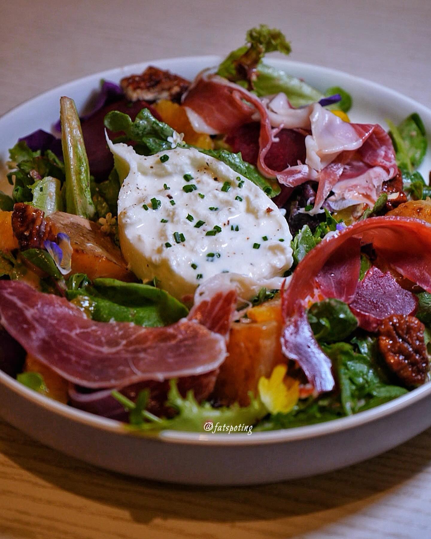 Burrata with Beets Variation, Citrus, and Candied Pecan Salad
