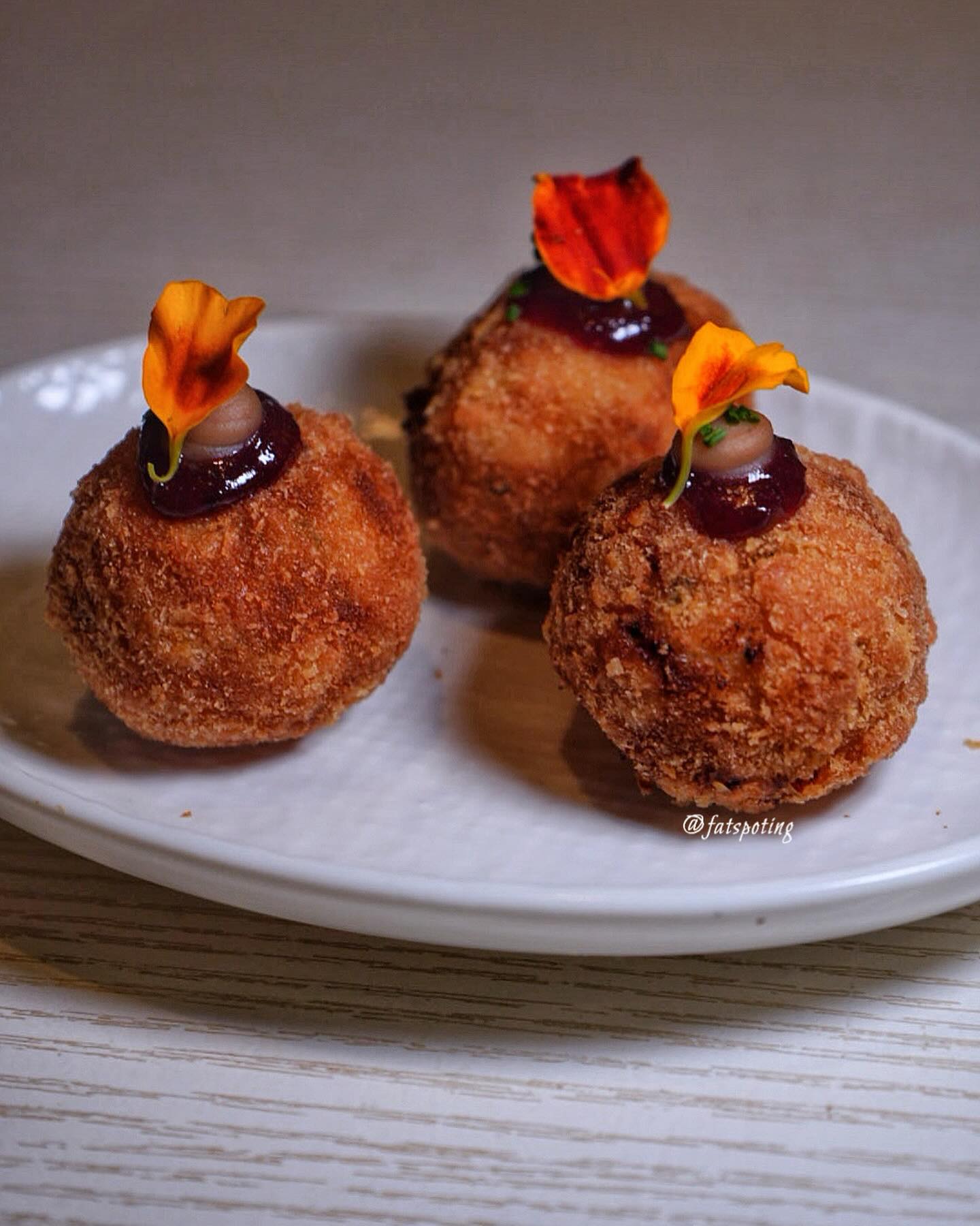 Smoked Duck Croquette with Chestnut Puree and Cherry Gel