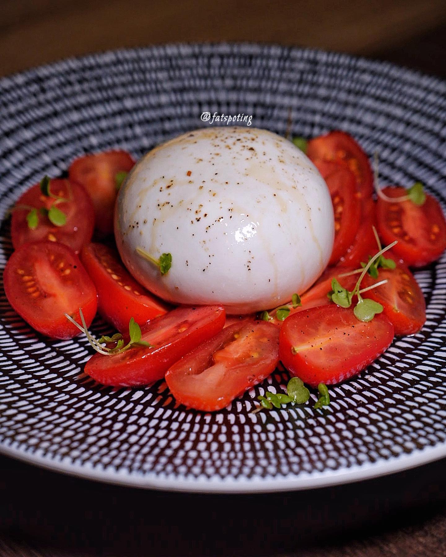 🧀 Artisanal burrata cheese with datterini tomatoes, apple balsamic, and calabrian oregano
