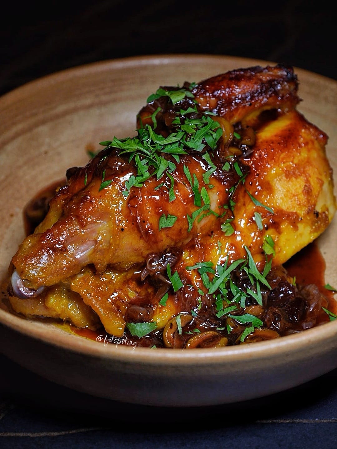 Roasted chicken baked with prunes, olives and shallots. Juicy and aromatic, it strikes a delicate balance between savory and sweet.