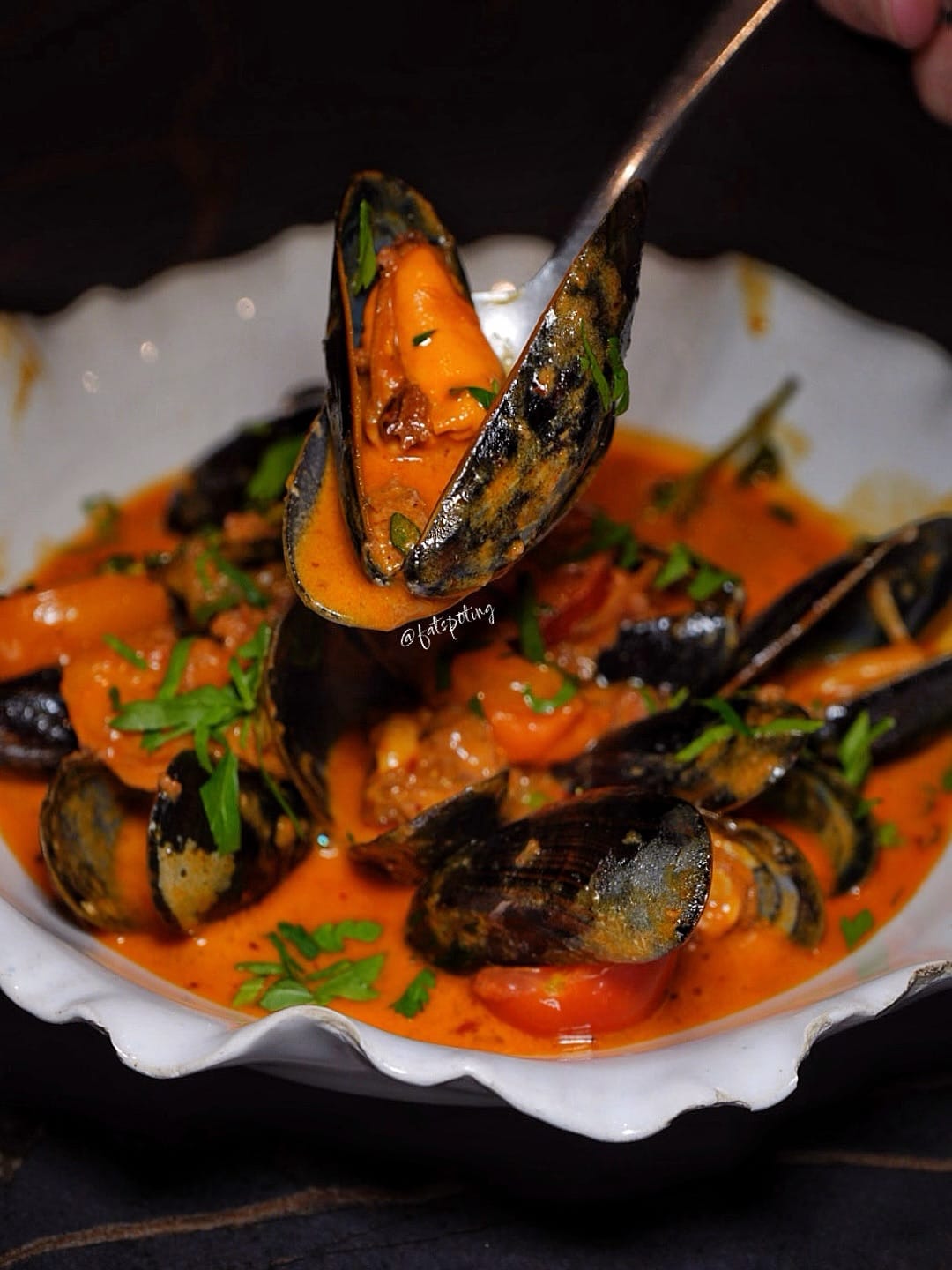 Mussels bathed in nduja cream and sweet cherry tomatoes.