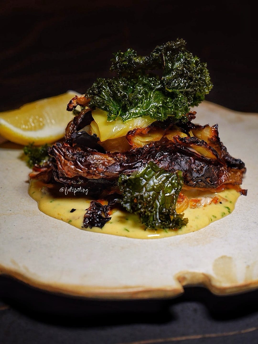 Grilled Hispi cabbage dressed in anchovy-garlic sauce and topped with fried kale - reveals layers of smokiness and umami, proving vegetables can take center stage.