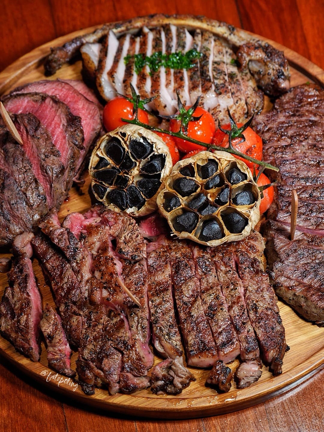 In Bedrock's dimly lit, whisky-den setting, the aroma of applewood smoke sets the stage for a standout feast. The platter showcases four exceptional mains, each prepared over Bedrock's signature applewood-fired grill: 🔥 Applewood Grilled Beef Tomahawk (200g) — A succulent, beautifully marbled cut that's smoky and tender. 🦞 Grilled Boston Lobster (250g) — Sweet, buttery, and charred to perfection. 🥩 US Prime Ribeye MB 3+ (200g) — Richly marbled with a deep, beefy flavor that melts in your mouth. 🐓 Herb-Rubbed Chicken Breast (120g) — Juicy, aromatic, and perfectly grilled. Complementing the mains are Classic Truffle Fries, Sautéed Broccolini, and Creamy Mashed Potatoes, rounding out a truly indulgent spread.