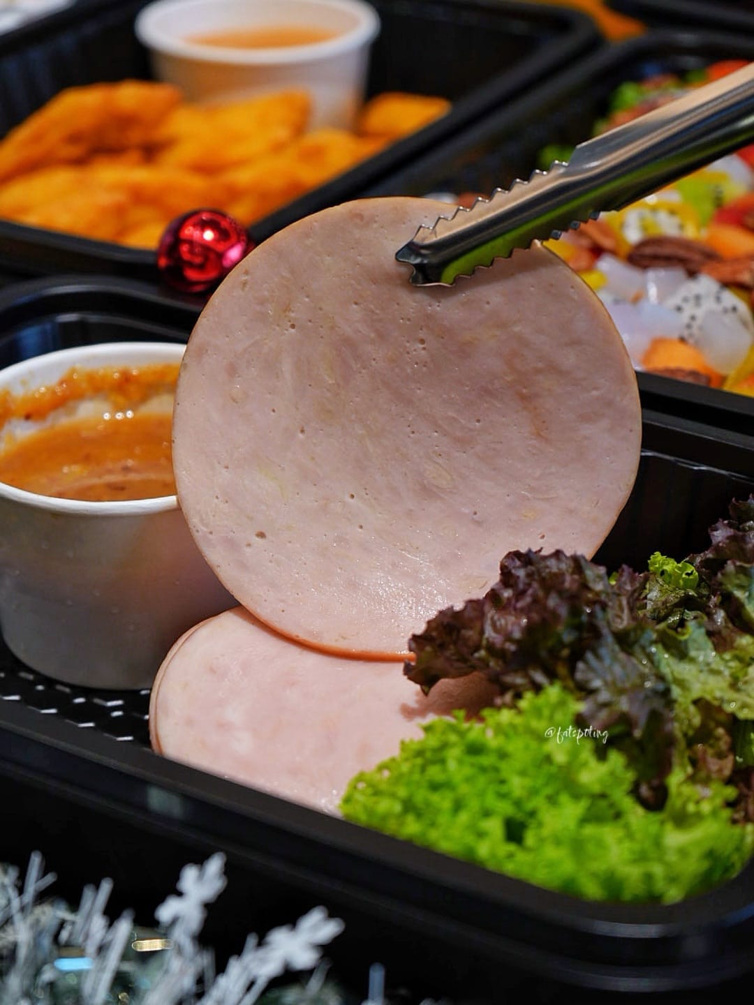 The menu opens on a refreshing note with Tropical Fruits with Strawberry Yoghurt Dressing, before moving into a generous selection of proteins. Highlights include the Garlic Rosemary Rotisserie Chicken, roasted until tender and aromatic, alongside Honey Baked Chicken Ham and Festive Duo Chicken Sausages that anchor the spread with familiar festive flavours. Seafood options are well represented by the Diavolo Prawn (Spicy) and the Crispy Dory Fillet with Tartar Sauce, adding variety and richness. Sides include Honey Glazed Baby Potatoes, Baked Mac and Cheese, and Mixed Garden Salad for balance. The Assorted Mini Quiches (three varieties) bring a touch of elegance, while the spread concludes with Assorted Mini Cupcakes — a sweet, festive finish.