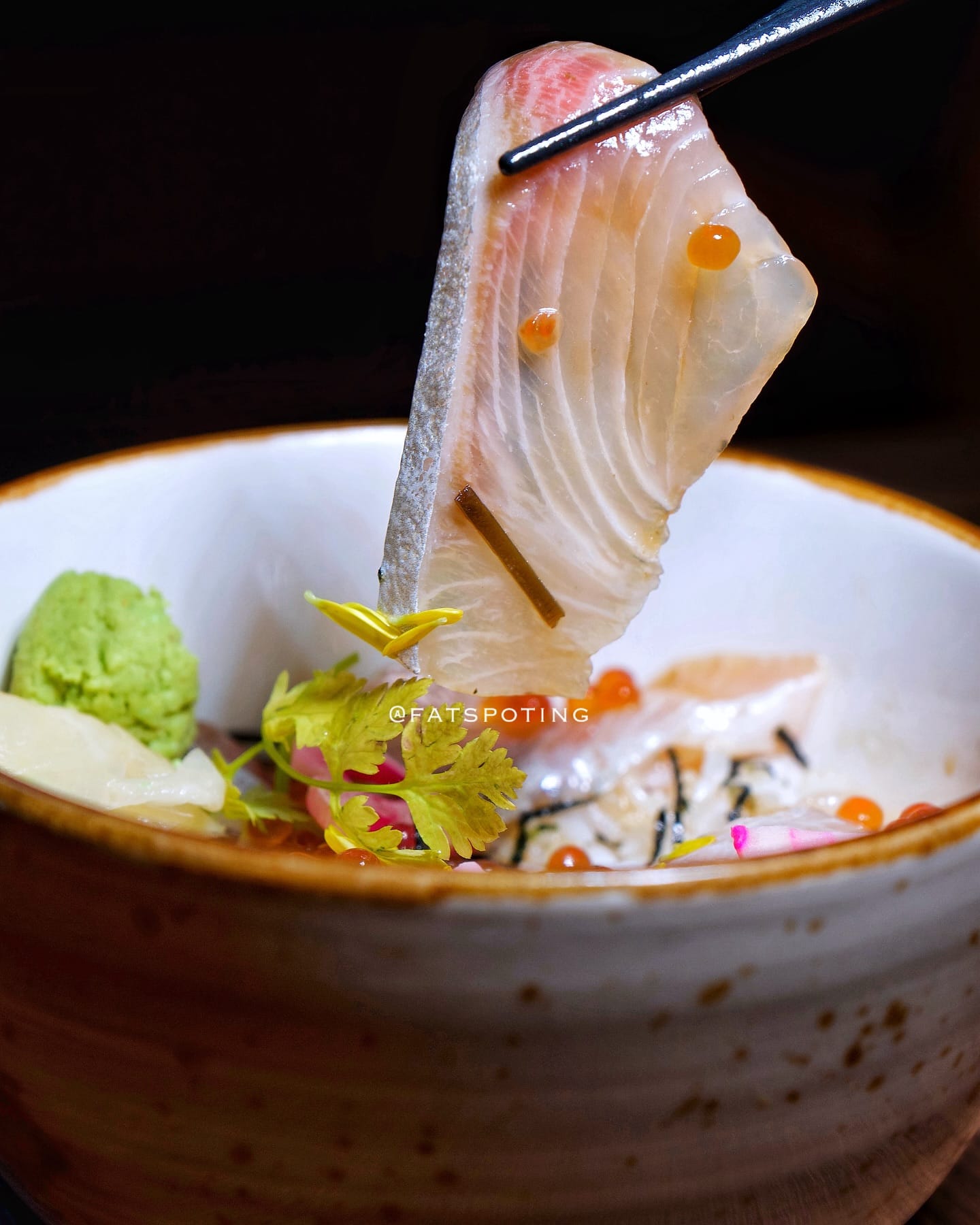Amberjack marinated in truffle and shiokonbu, topped with salmon roe on rice