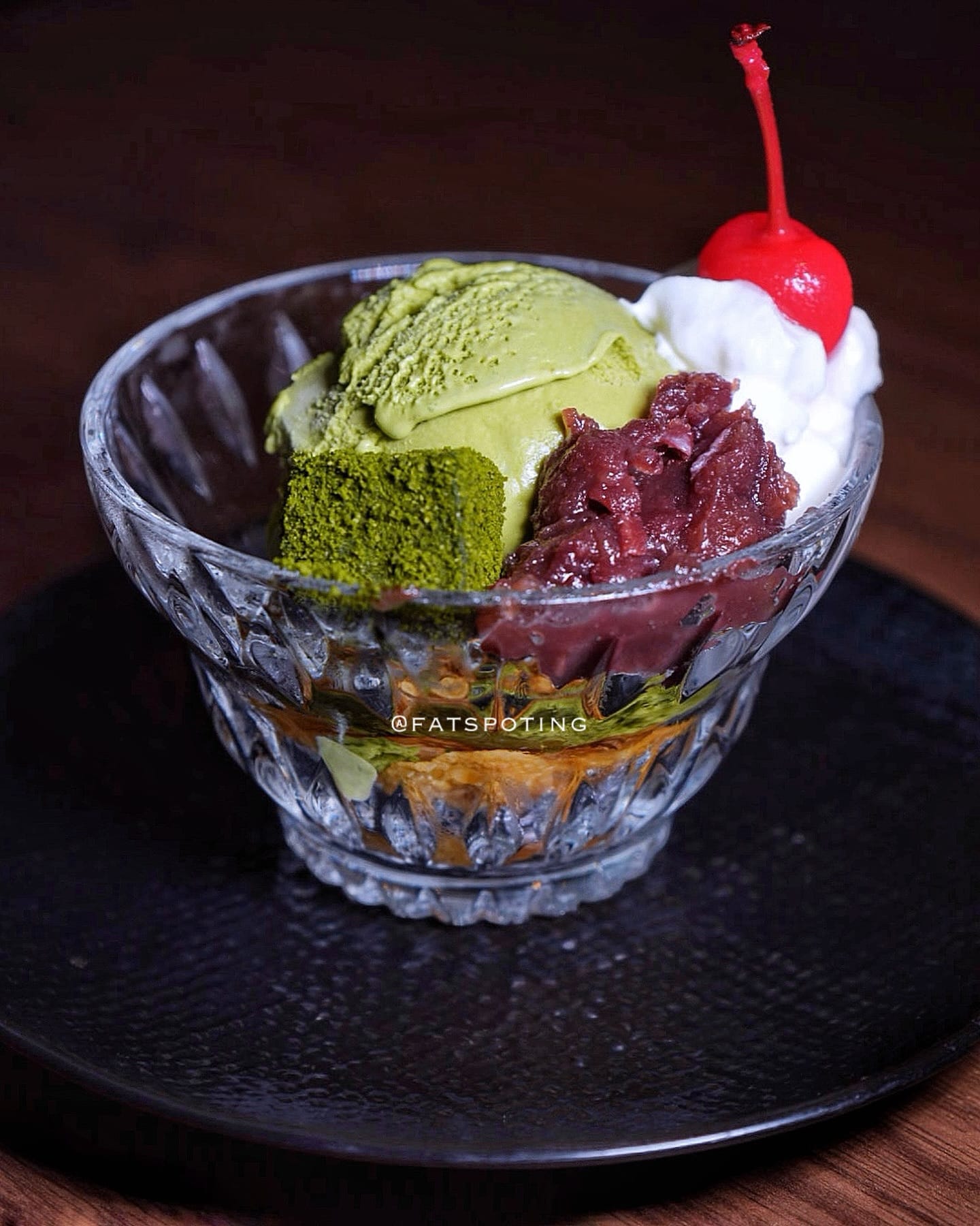 Matcha-flavored ice cream, warabi mochi, red beans, and strawberry