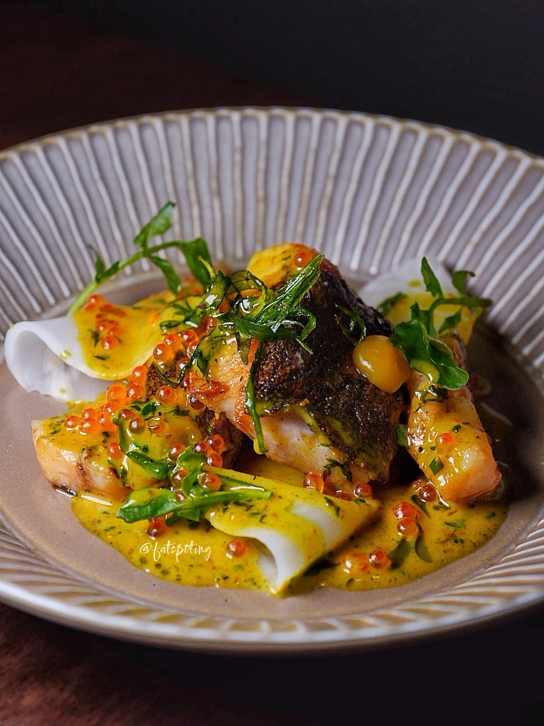 Buttery cod with a Madras curry beurre blanc, passionfruit gel, trout roe, and salt-baked celery root. A beautiful balance of richness, spice, and acidity.