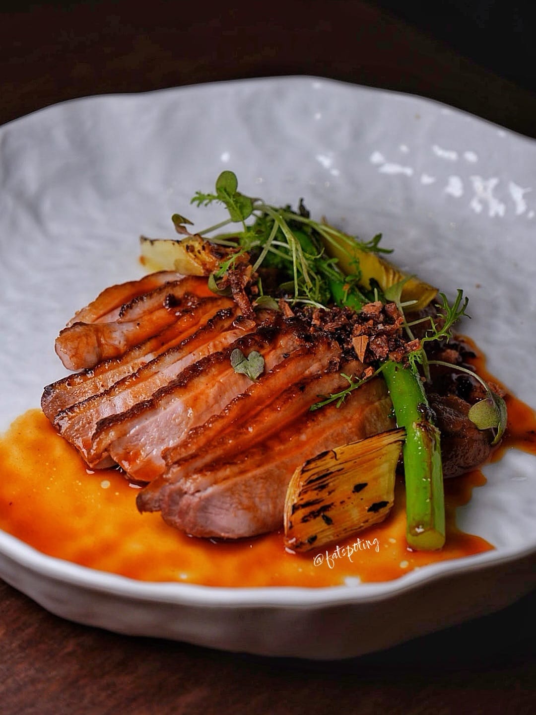 Juicy duck breast with duck leg confit, allium medley (onion cream, pickled pearl onion, charred leek), and glossy duck jus. Elegant and deeply savoury.