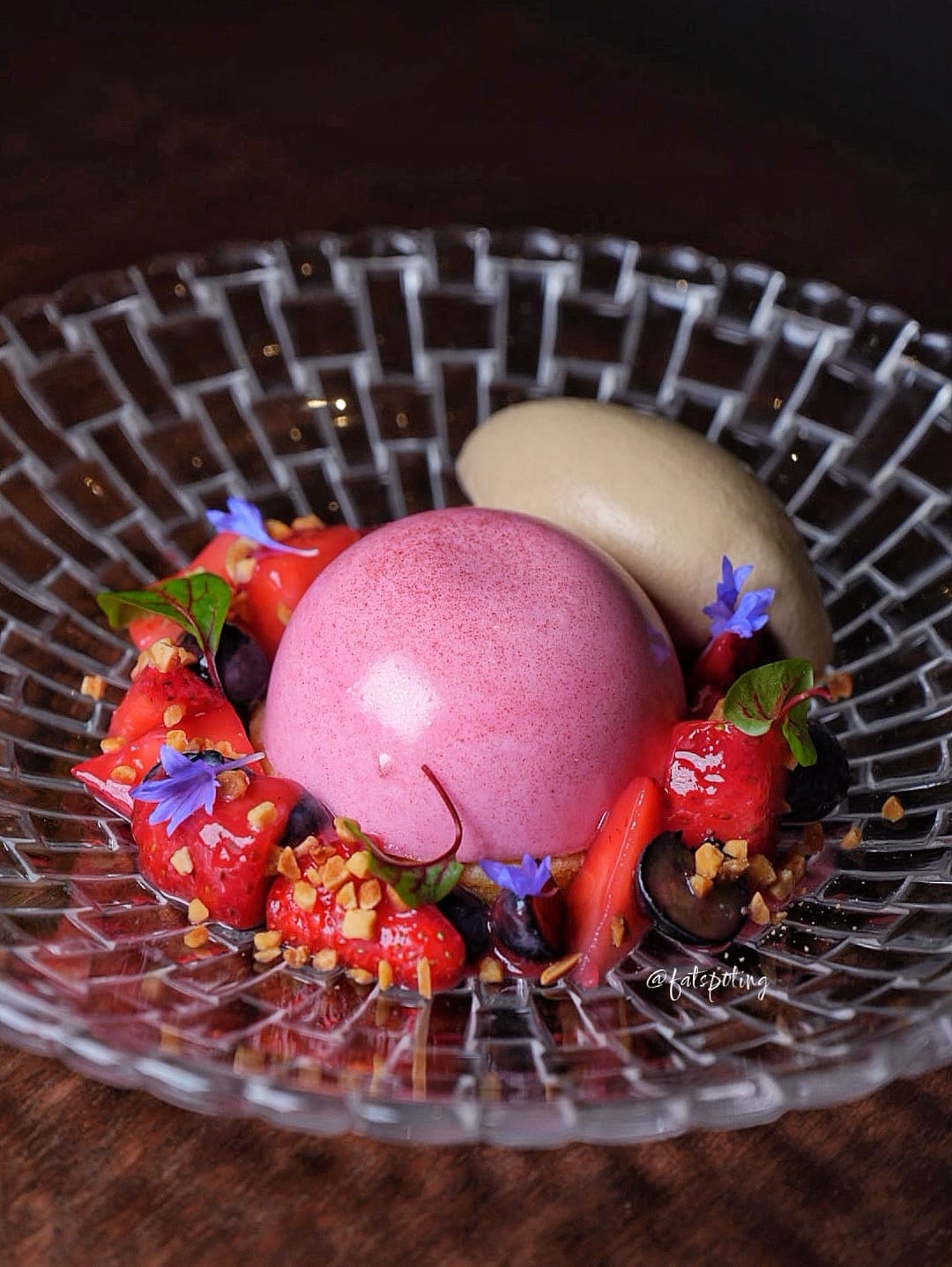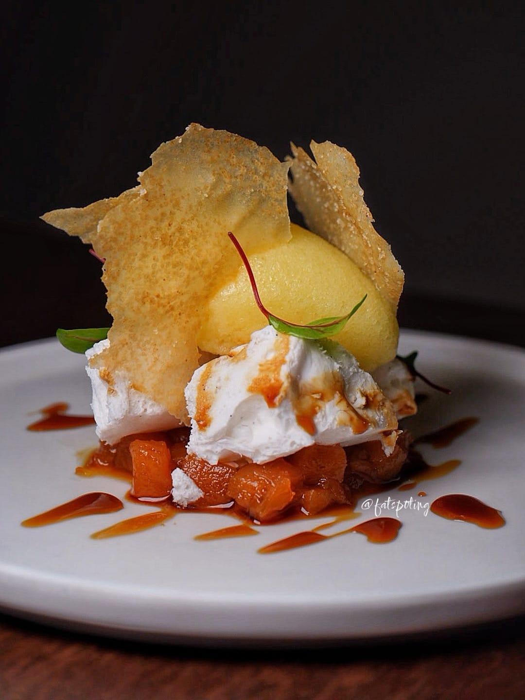 🍥Piña Colada Frozen coconut parfait, rum caramelised pineapple, pineapple sorbet, gula melaka sauce.