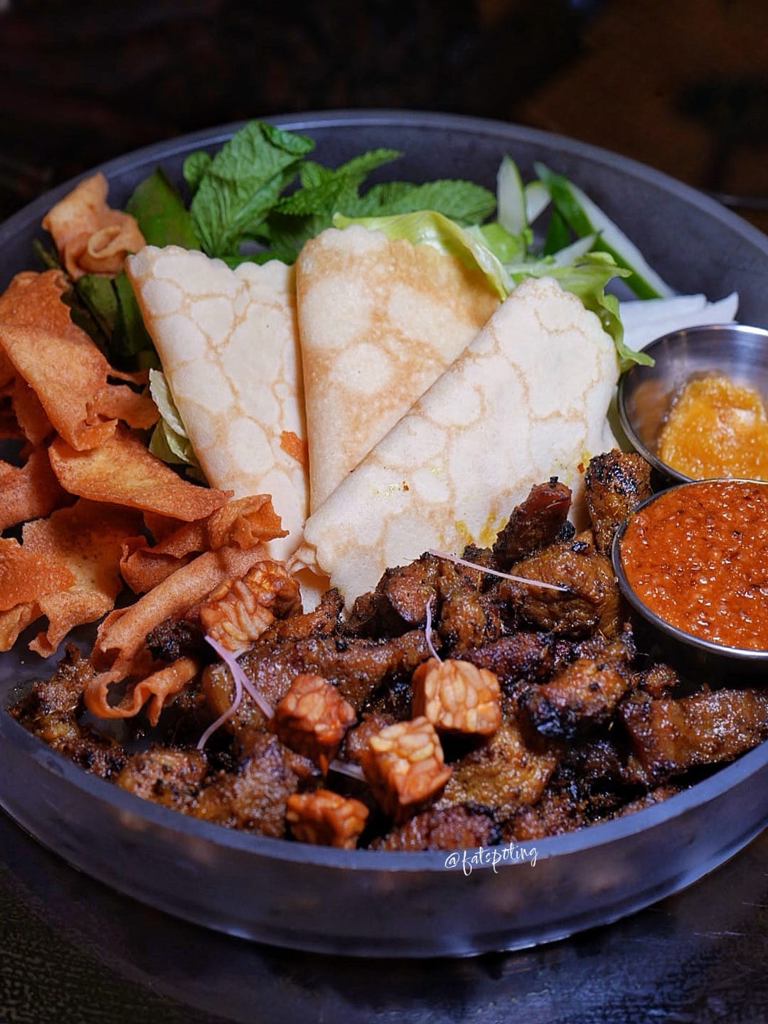 Pork satay reimagined as DIY popiah wraps with herbs, pineapple jam and peanut sauce.