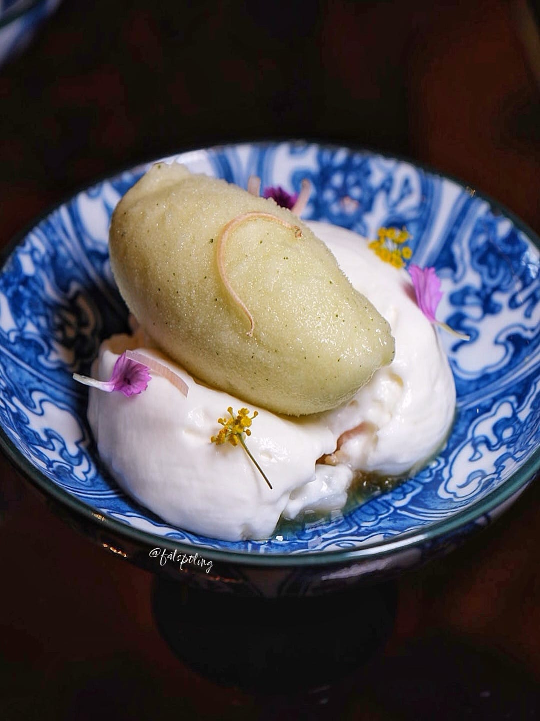A layered dessert pairing baijiu-spiced pineapple chutney with lychee, sorbets, and coconut ice cream.