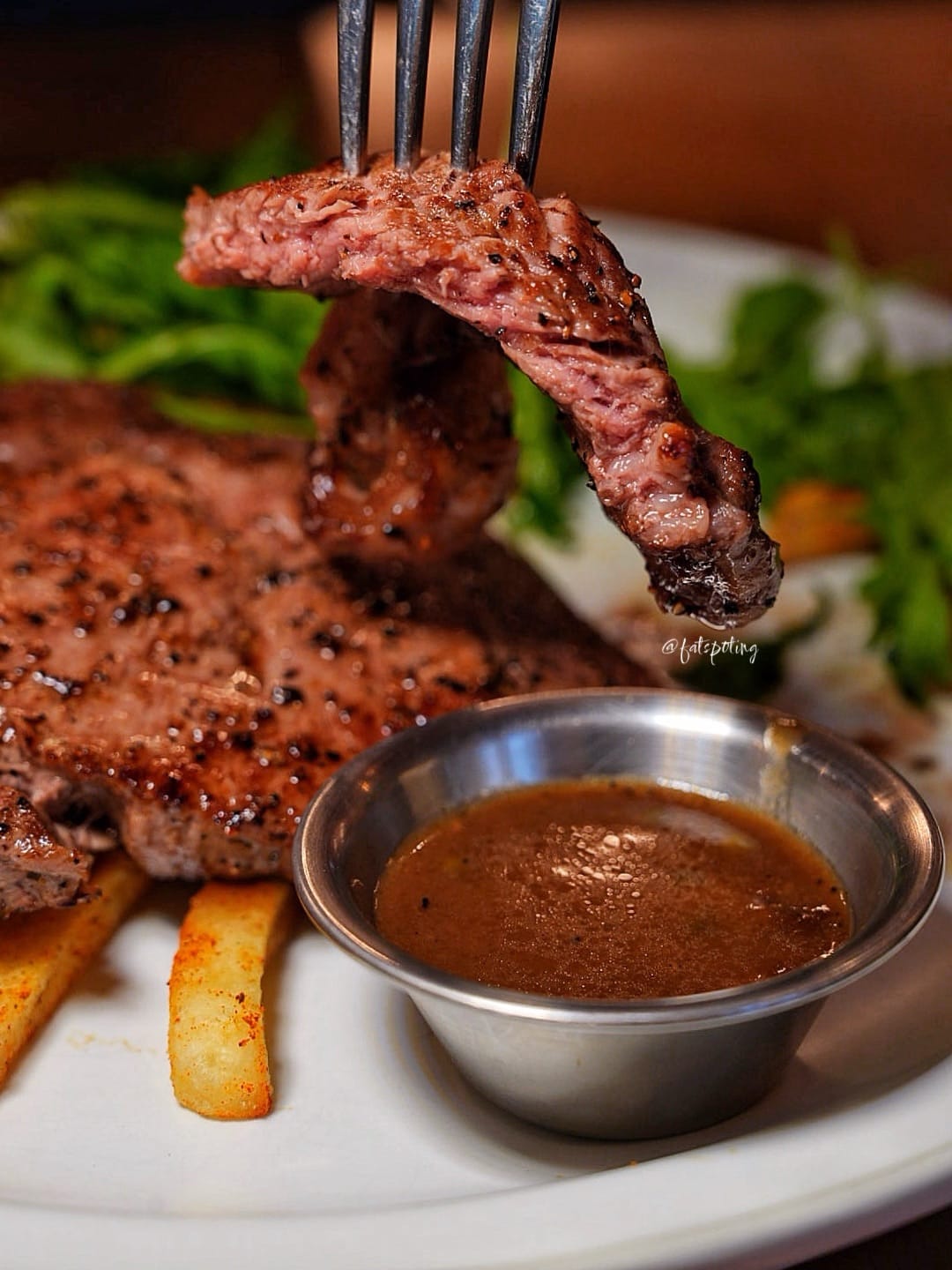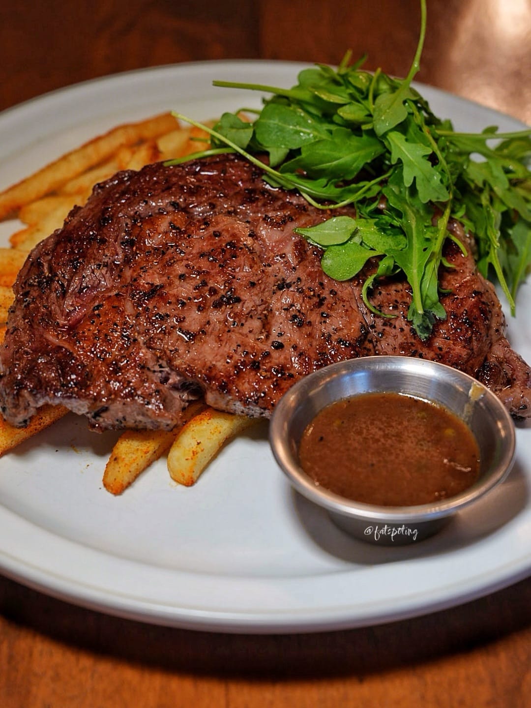 A classic where the ribeye is paired with green peppercorn jus and served alongside crisp herbed fries and peppery rocket.