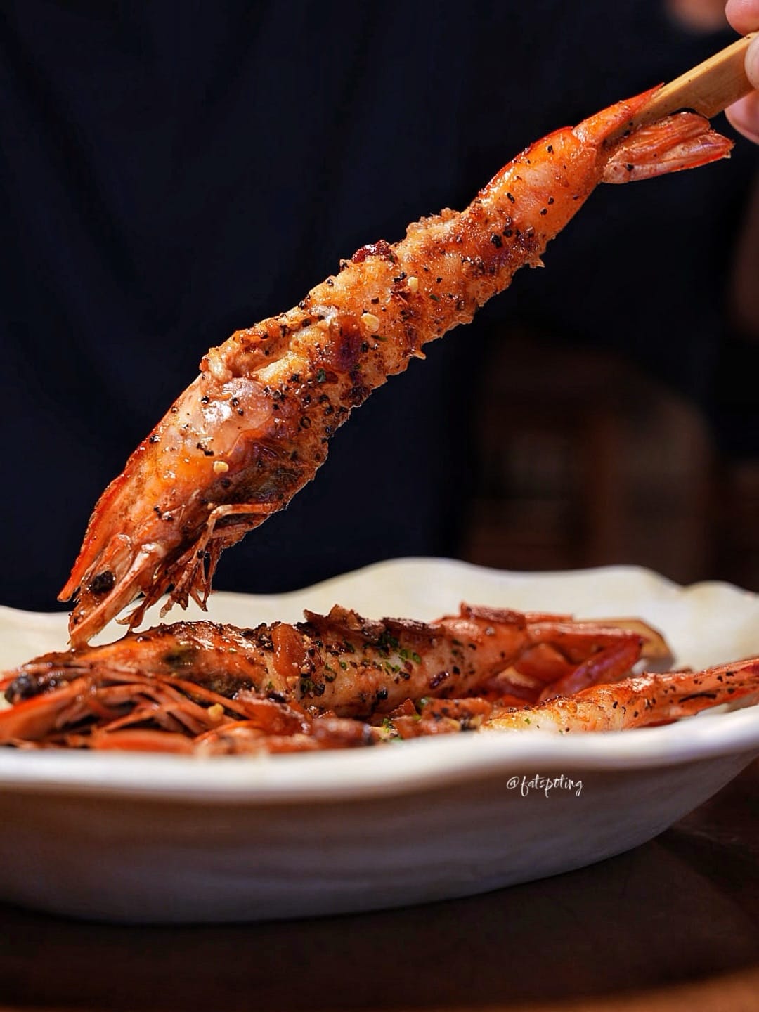 The prawns carry a light smokiness from the grill and are complemented by fragrant garlic and chilli oil.
