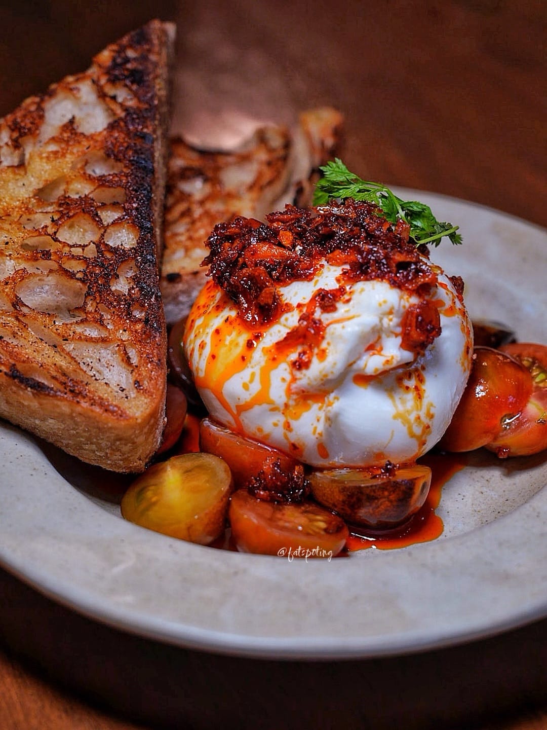 Creamy burrata balanced with the brightness of heirloom tomatoes. The house chilli crisp introduces a subtle heat, while balsamic glaze adds sweetness and acidity.