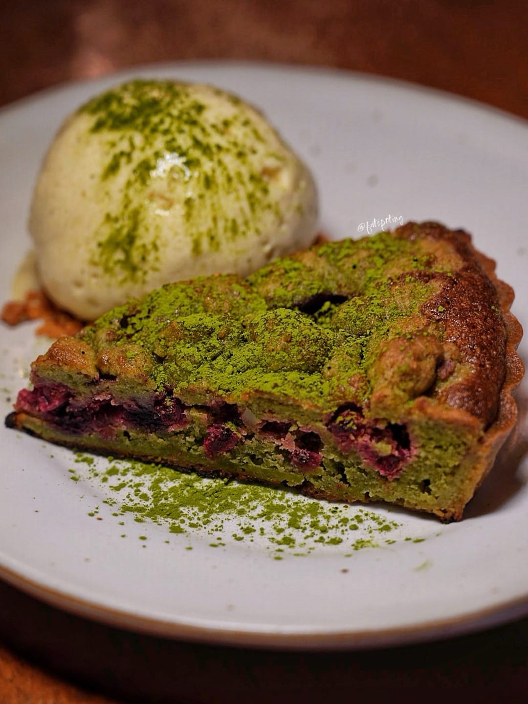 A dessert that leans confidently into matcha’s earthy notes. Multiple components, from pastry cream to streusel, reinforce the flavour profile, while blueberries introduce acidity and the vanilla bean gelato softens the bitterness. A thoughtfully constructed dessert for matcha enthusiasts.