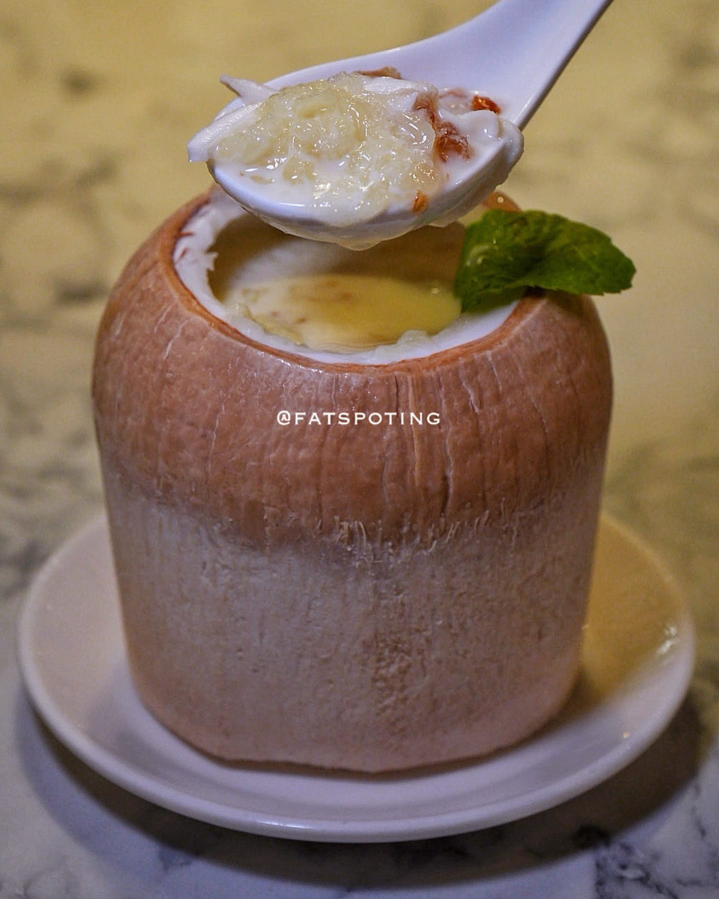 For dessert, the Aiyu Jelly with Peach Gum & Coconut Milk served in Whole Coconut is a delightful tropical indulgence. The delicate texture of peach gum combined with the creamy richness of coconut milk and the refreshing Aiyu jelly, elegantly presented in a whole coconut, creates a perfect ending to the dining experience.