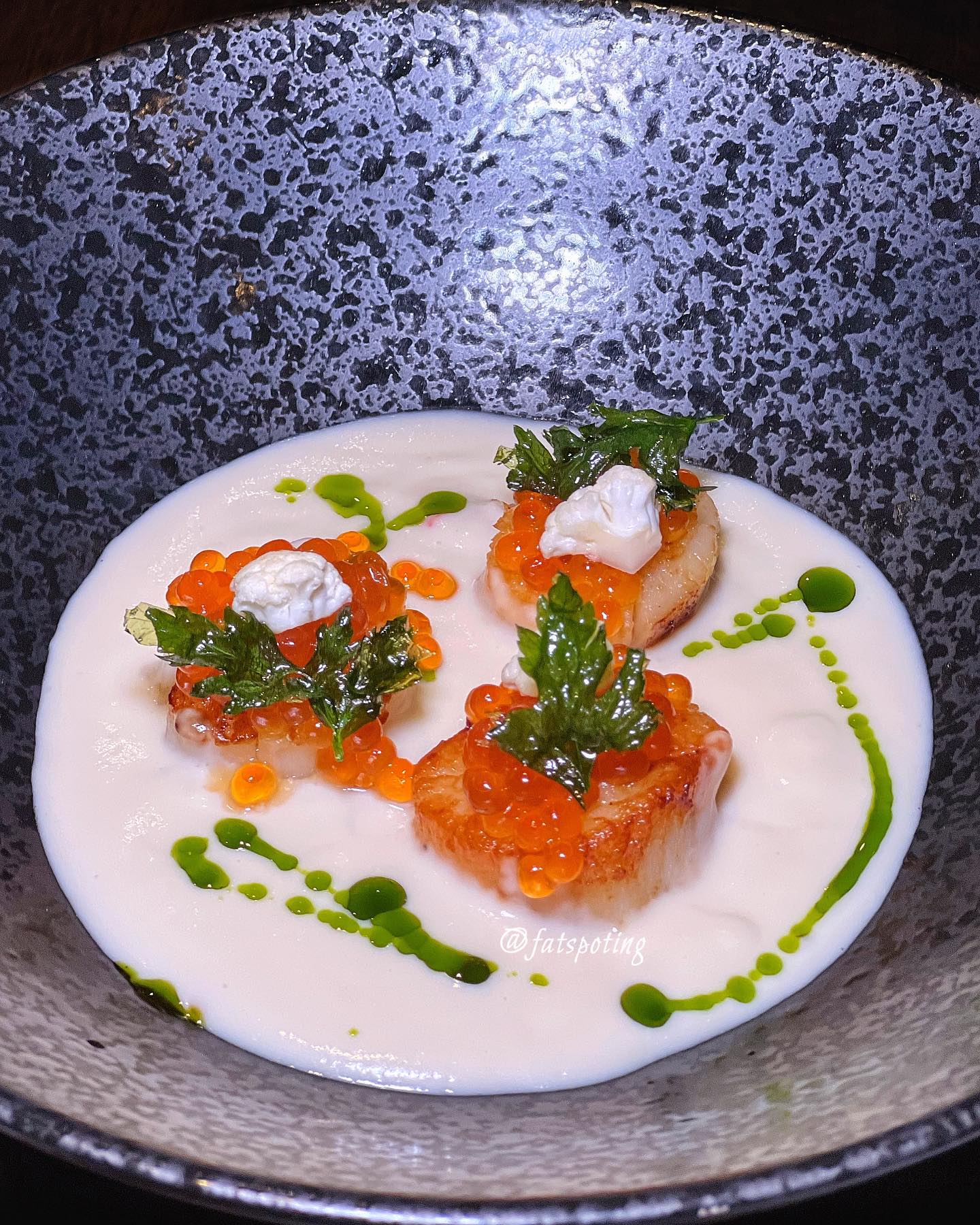 Seared scallops served with a velvety cauliflower puree, offering a delightful textural contrast. The addition of pickled cauliflower and savory Ikura pops brings a burst of flavor to this elegant dish.