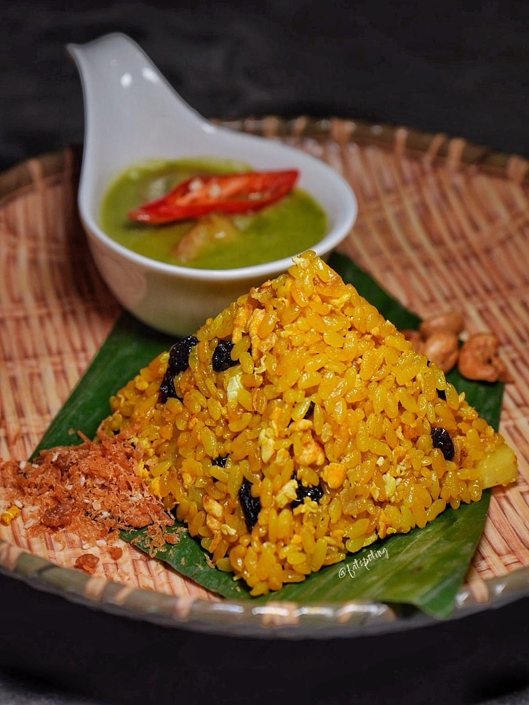 The Shokaku short-grain rice is lustrous, adorned with raisins and cashews, and paired with plant floss that adds that umami thread. Accompanying it is a luscious green curry loaded with baby green eggplants and cherry tomatoes.