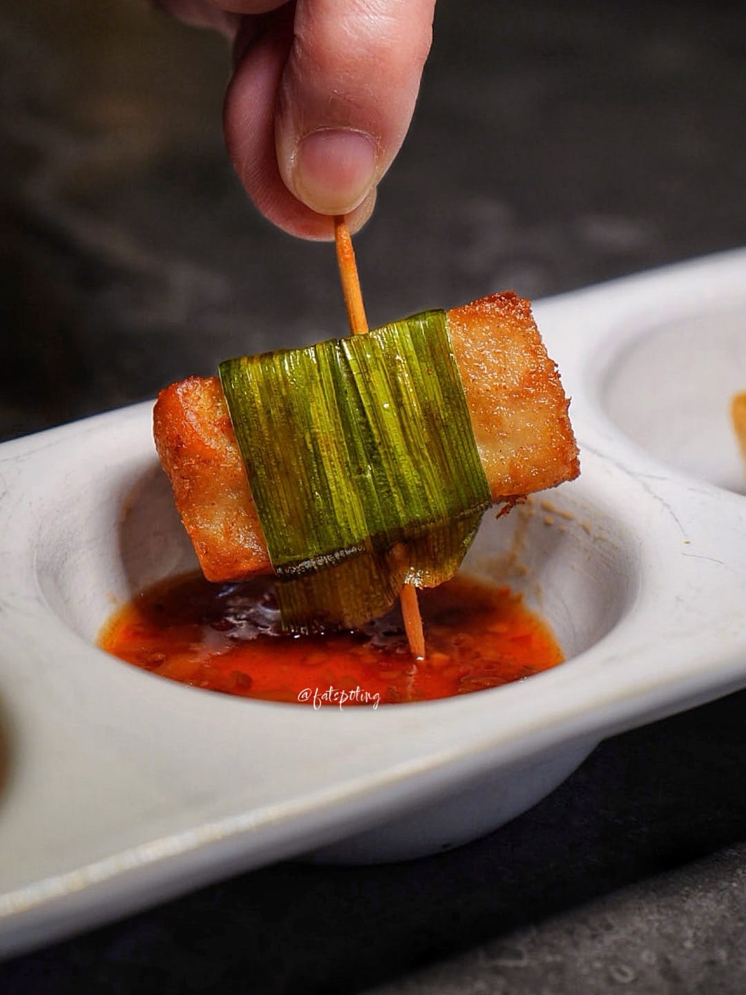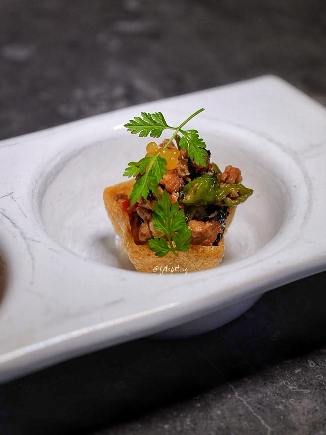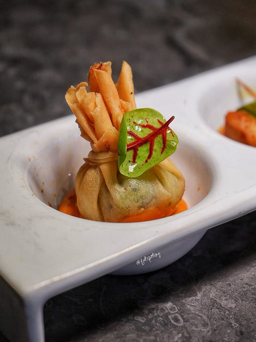 A trio of Thai-inspired bites - a crispy dumpling with curried vermicelli, a fragrant pandan “chicken”, and a spicy mushroom tartlet.