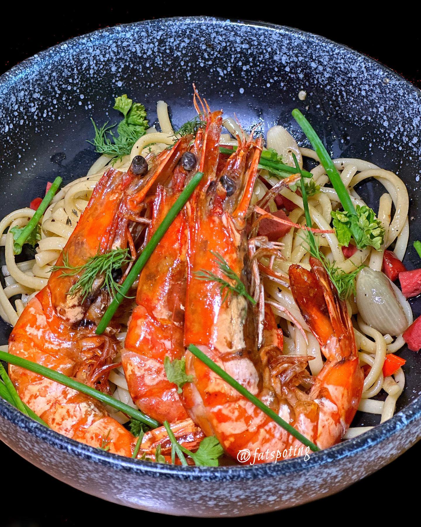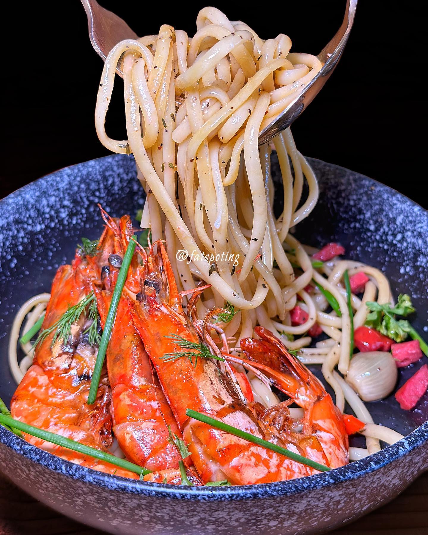 Pasta is tossed with prawn head butter, garlic, coriander, chilli padi served with Tiger prawns, and Chorizo