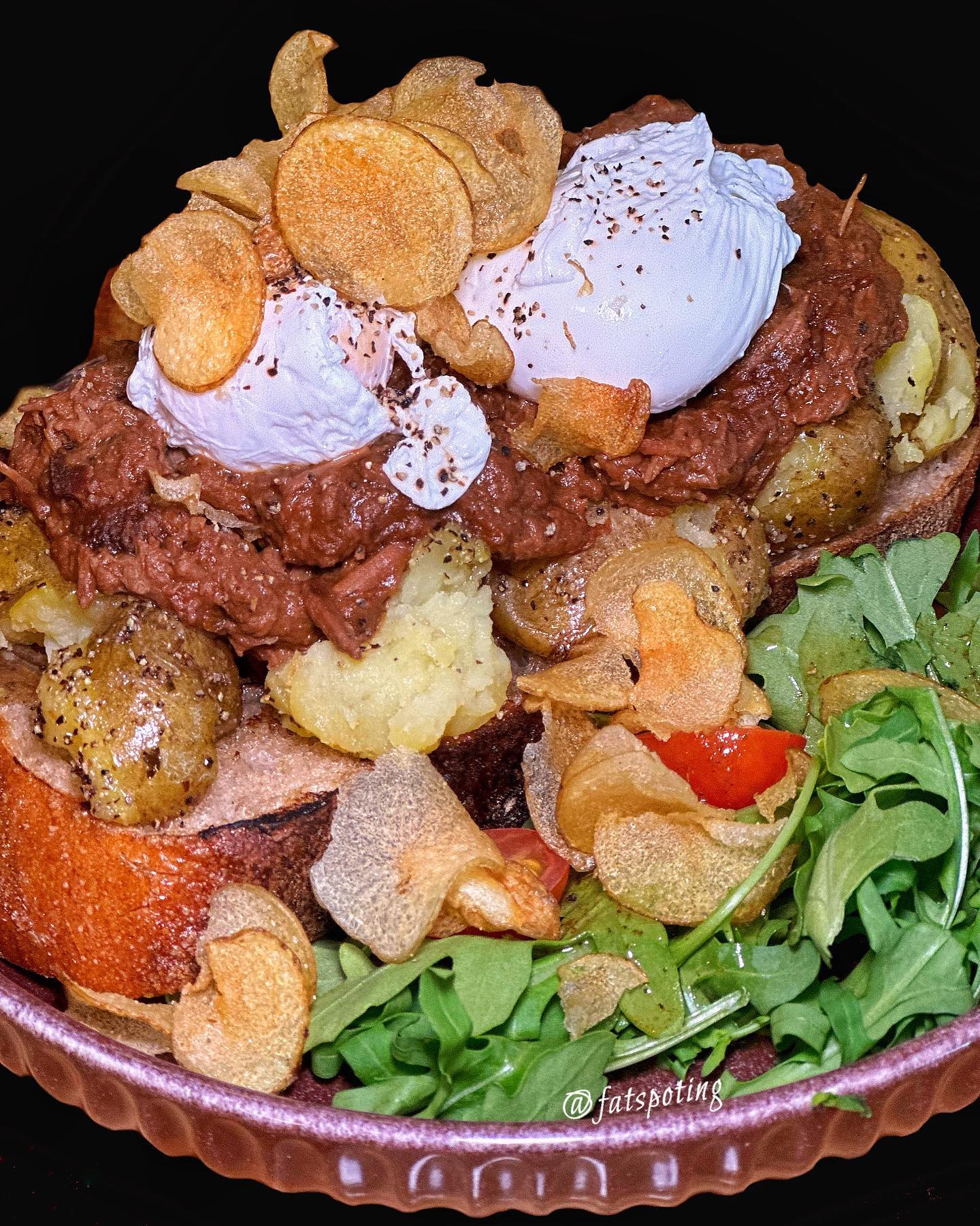 Consists of confit baby potatoes, poached egg, pickled shallots, hand-cut potato chips, mixed mesclun, and served on toasted sourdough
