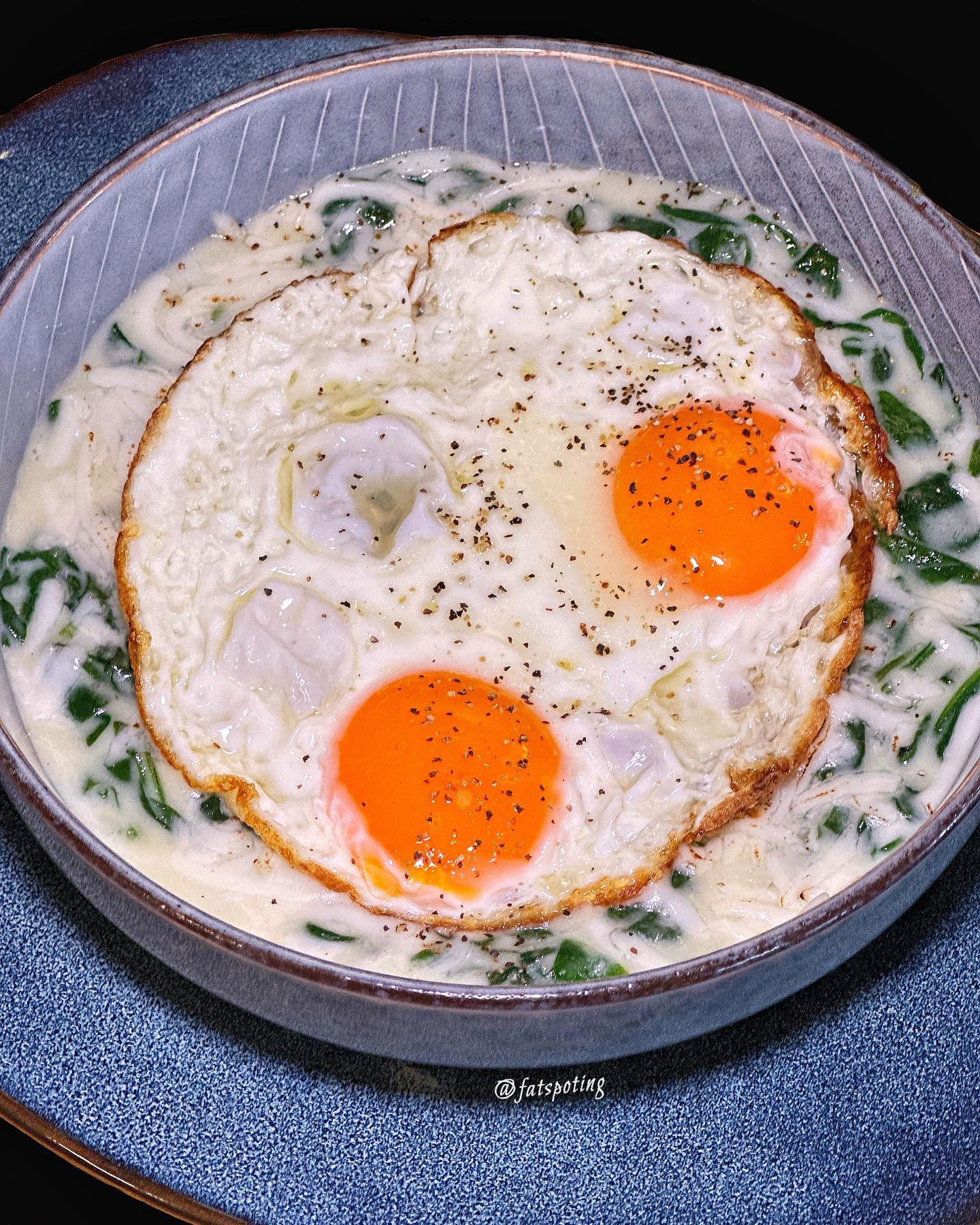With Gruyere cheese, bechamel sauce atop with 2 fried eggs
