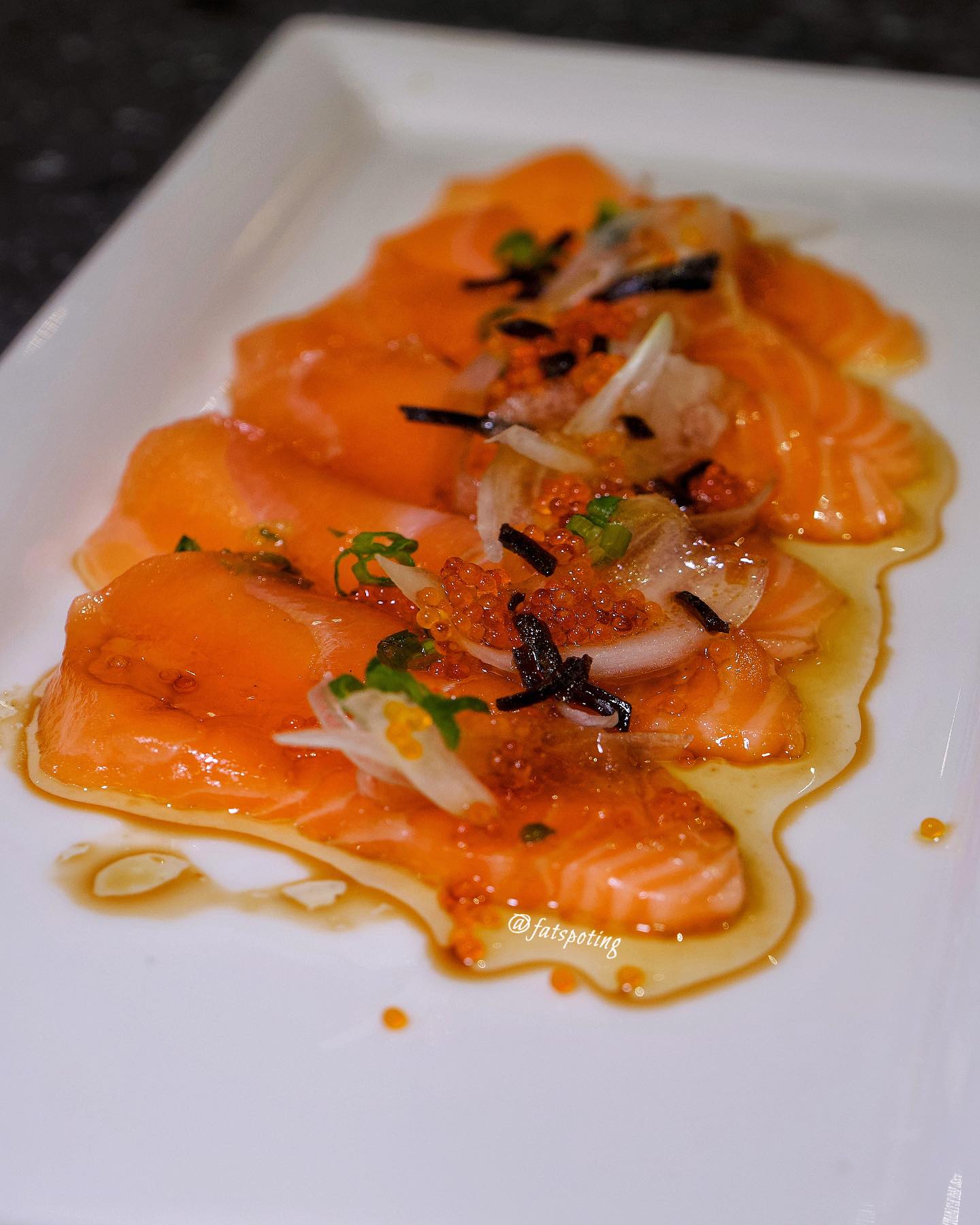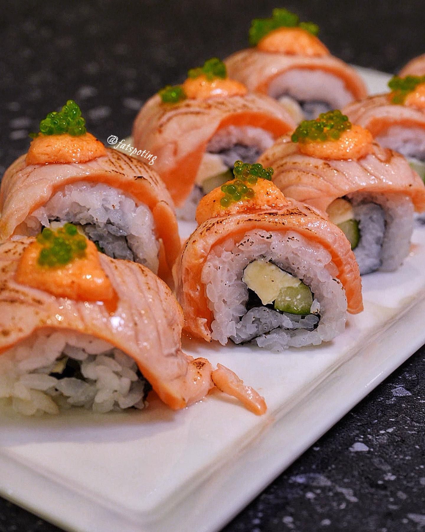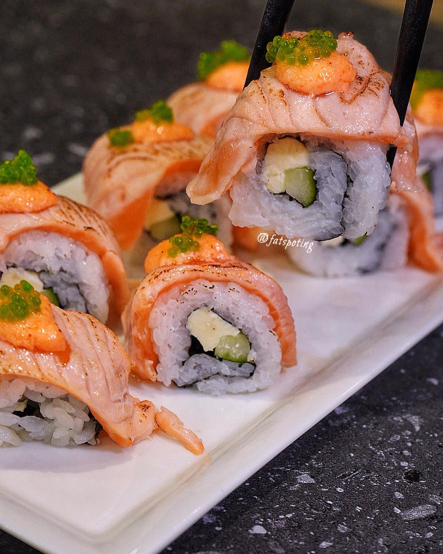 Flame-seared Norwegian salmon atop cream cheese and cucumber sushi roll.