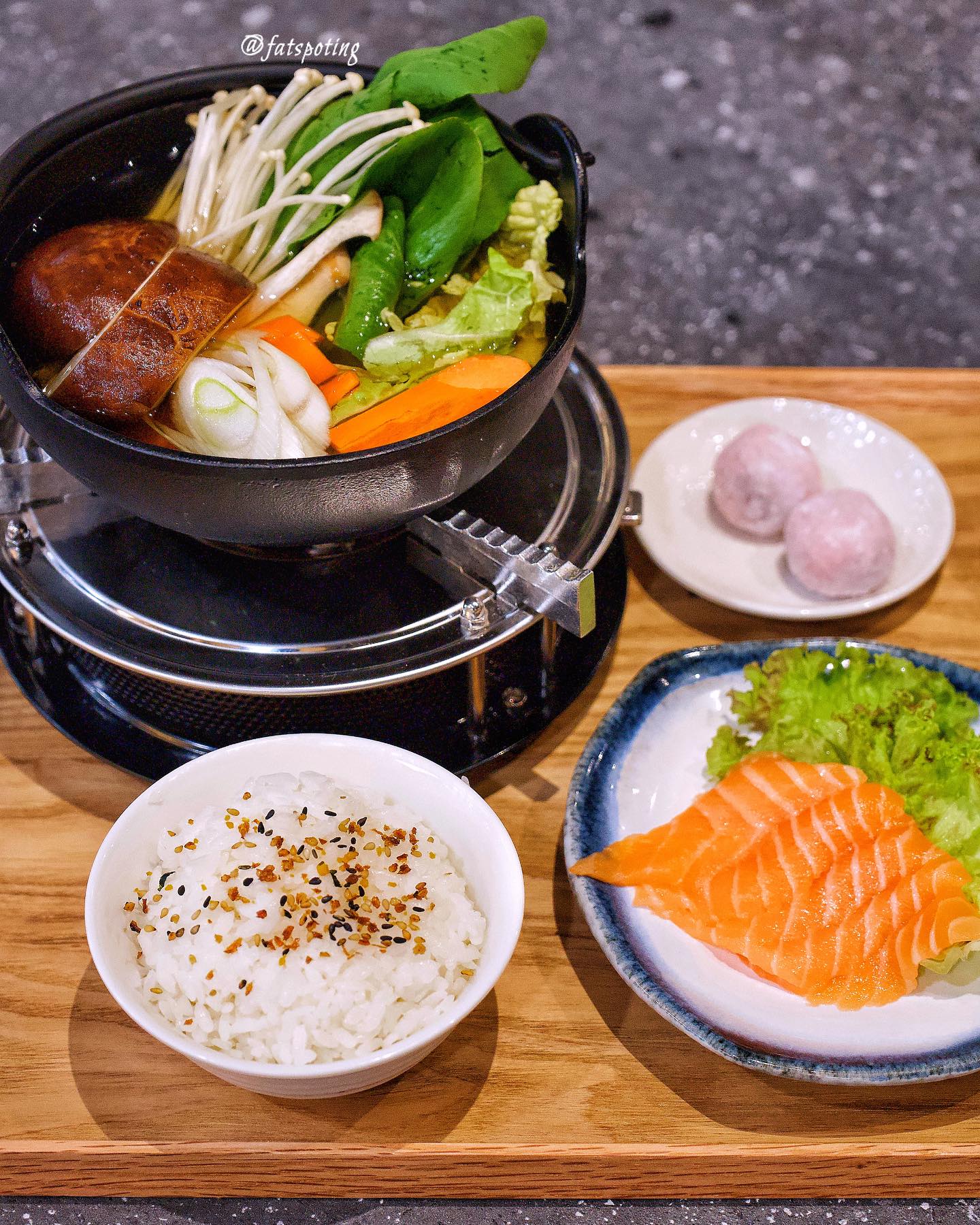 A bubbling hot pot of fresh ingredients— Norwegian salmon slices, assorted vegetables and mushrooms—in flavourful dashi broth; served with Japanese rice and dessert of the day.