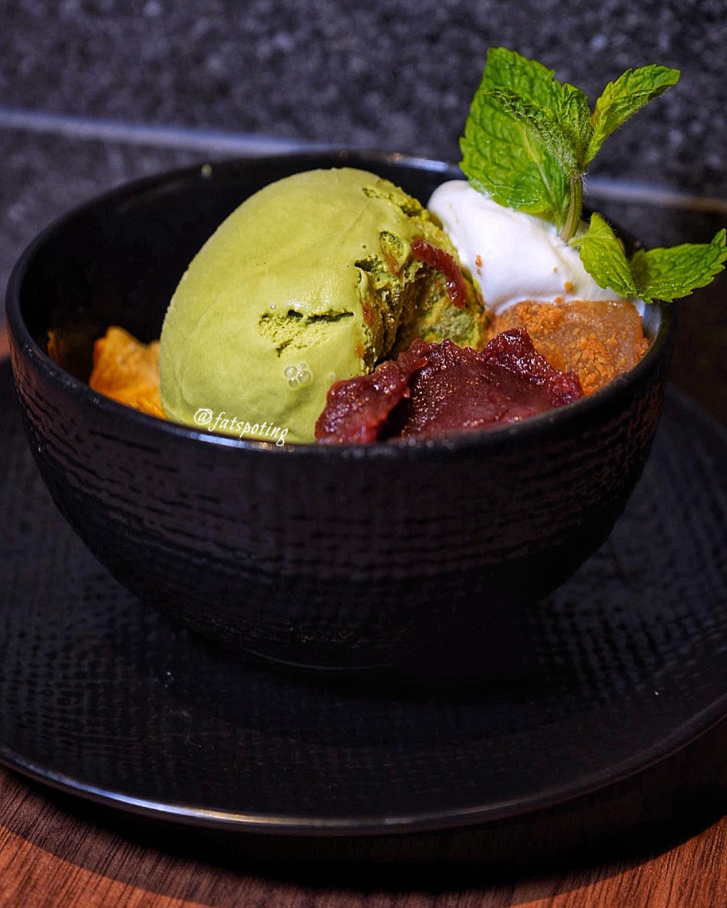 A delightful medley of matcha-flavored ice cream, warabi mochi, red beans and ripe strawberry.