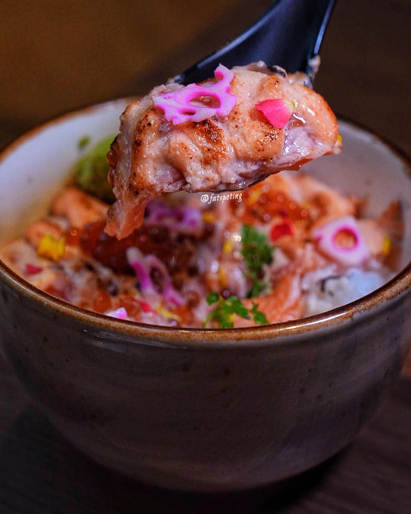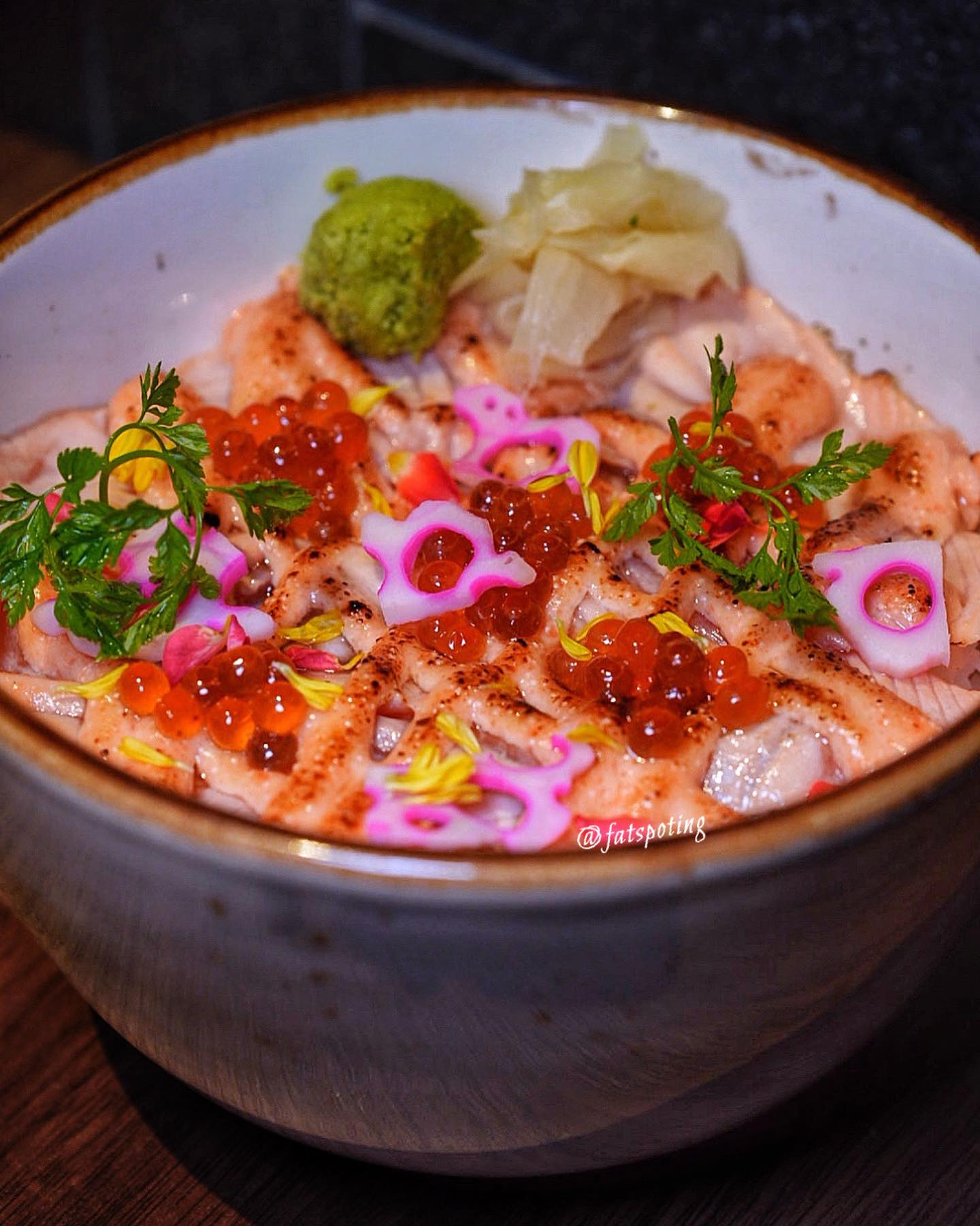 Lightly torched salmon slices glistening with mentaiko sauce, crowned with salmon roe, all nestled on a bed of rice.
