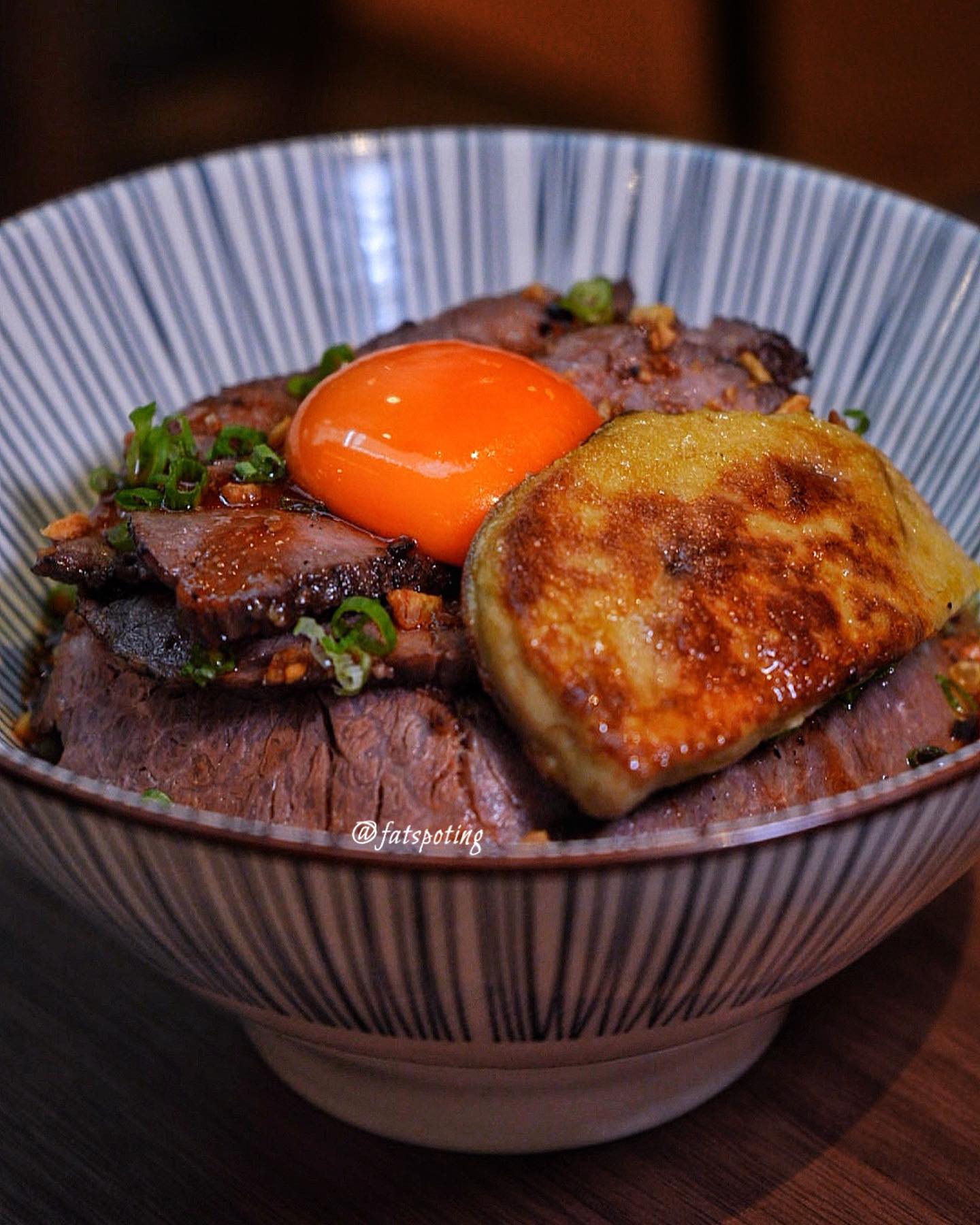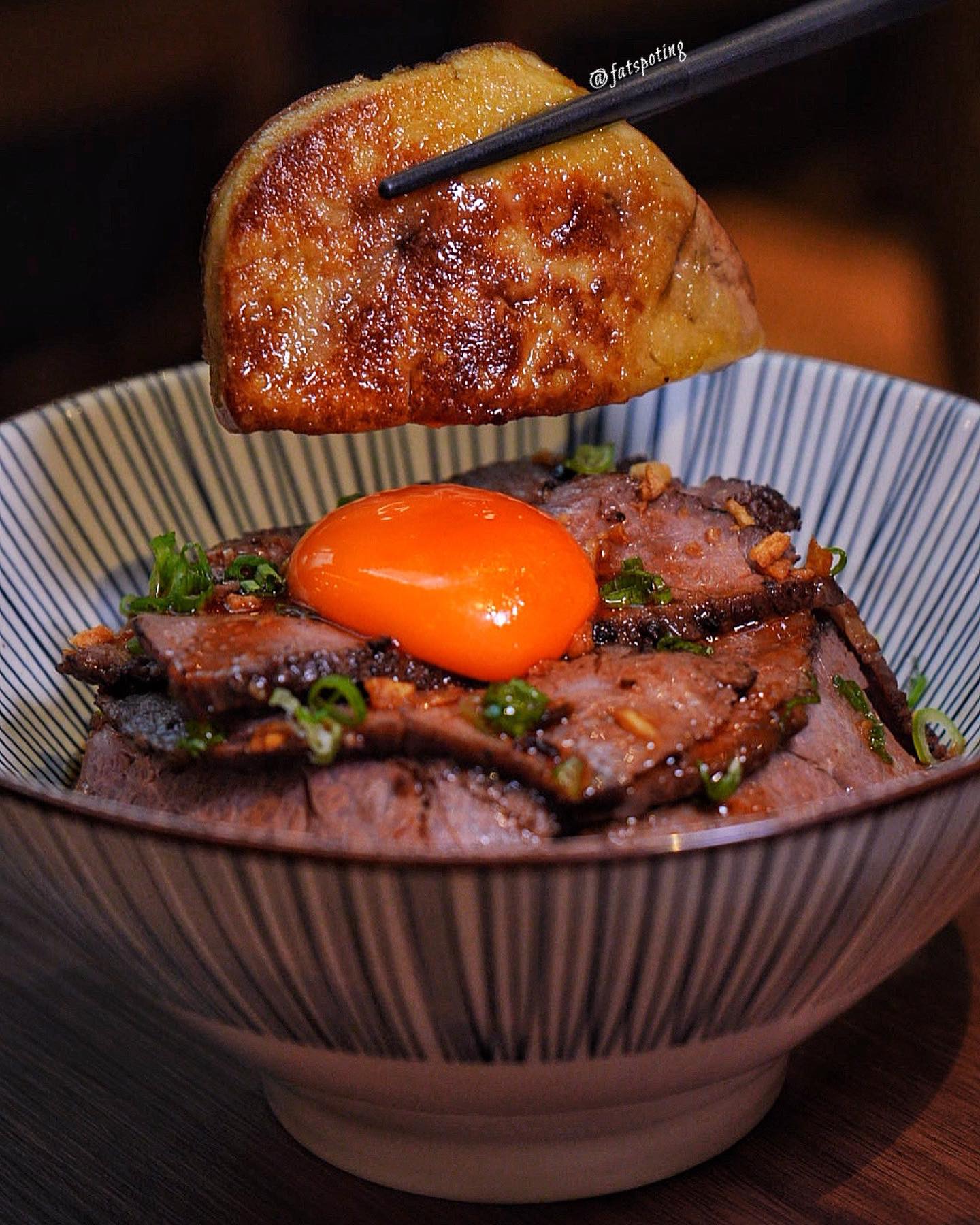 A masterpiece of A1/A5 Miyazaki roast Wagyu adorned with yakiniku sauce, crowned with creamy foie gras, and served atop a bed of fragrant Okinawa egg yolk-infused rice.