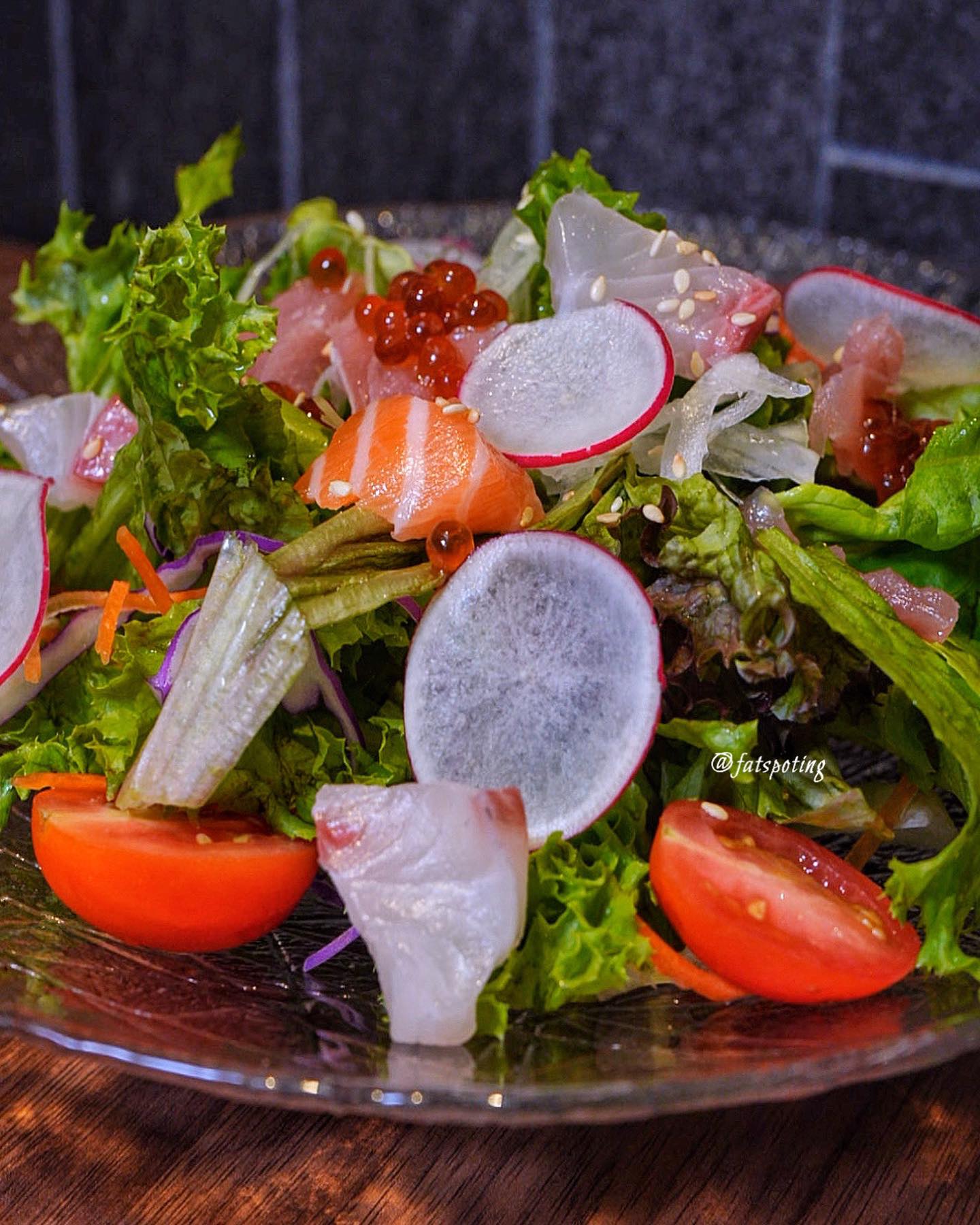 A refreshing mix of assorted sashimi atop a bed of crisp salad greens, elegantly dressed in Japanese Wafu dressing.