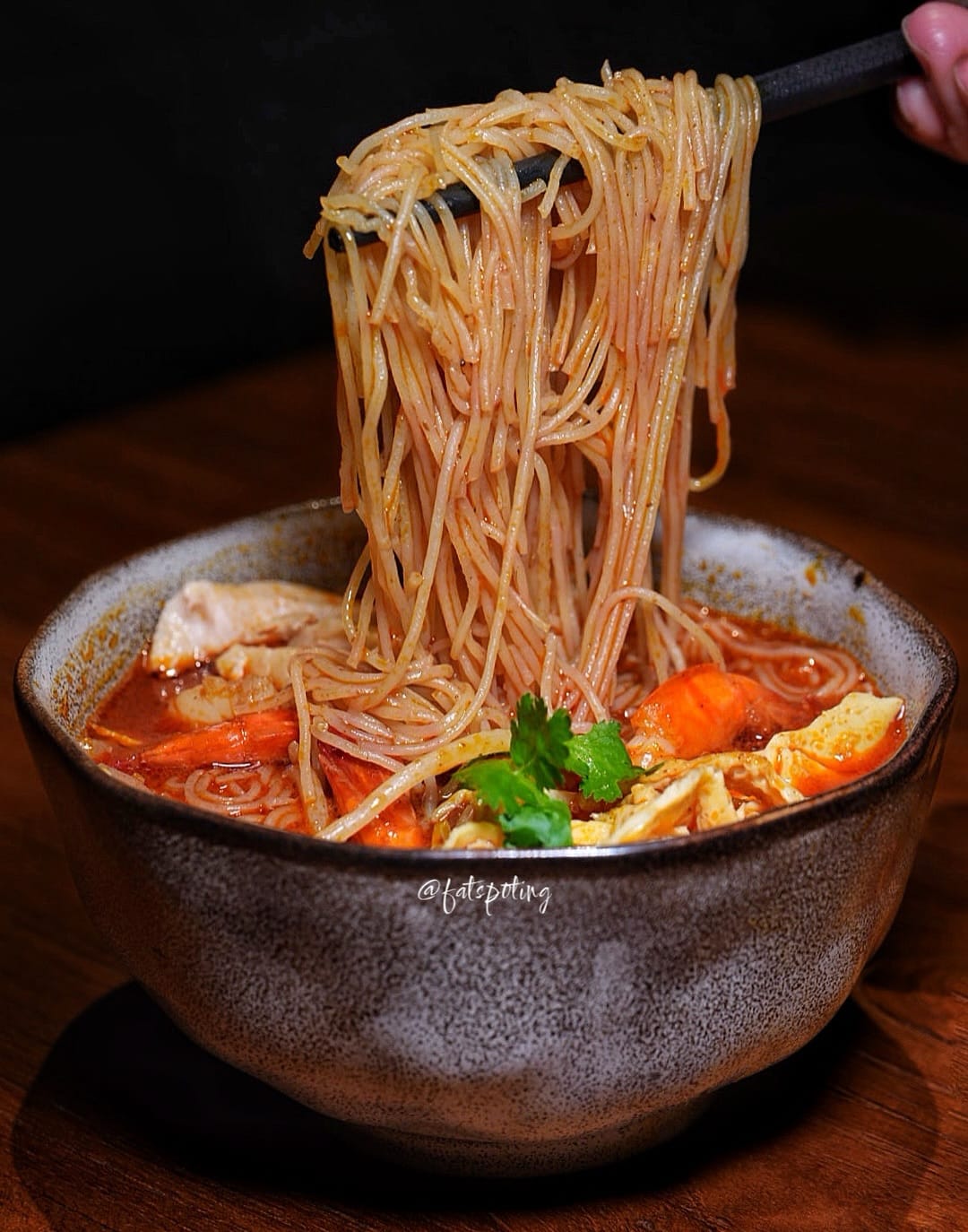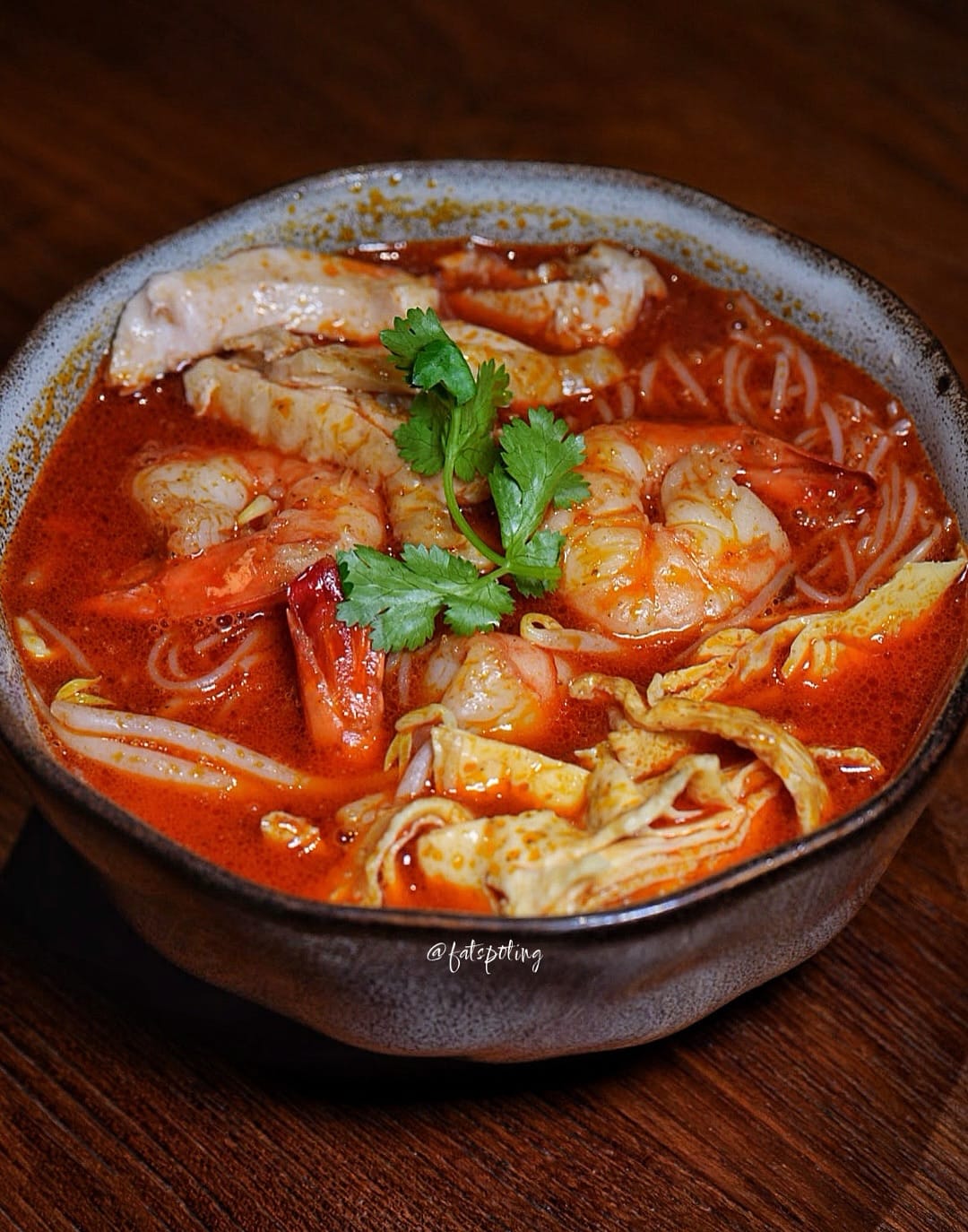 A spice-rich, coconut-laced broth with prawns, chicken, and egg ribbons. More herbal and complex than fiery — authentic to Sarawak, but gentler than Singapore’s laksa.