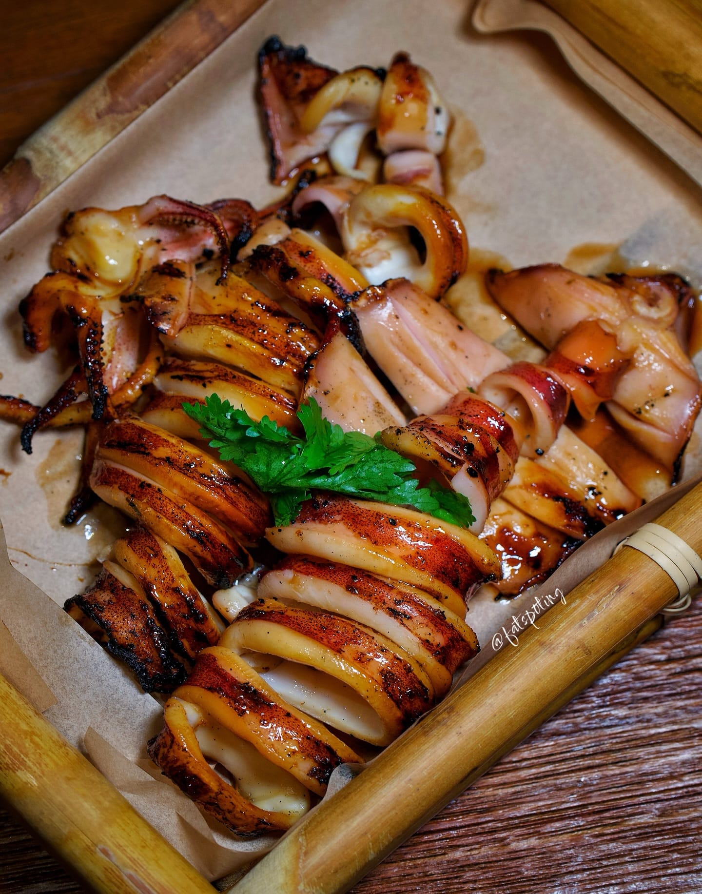 A whole squid, marinated Dayak-style, brushed with a gula-apong glaze, then grilled till it wears those perfect tiger stripes. The bite is tender with flavours that balance char, sea brine, and gentle caramel, that’s lifted further when dipped in sambal.