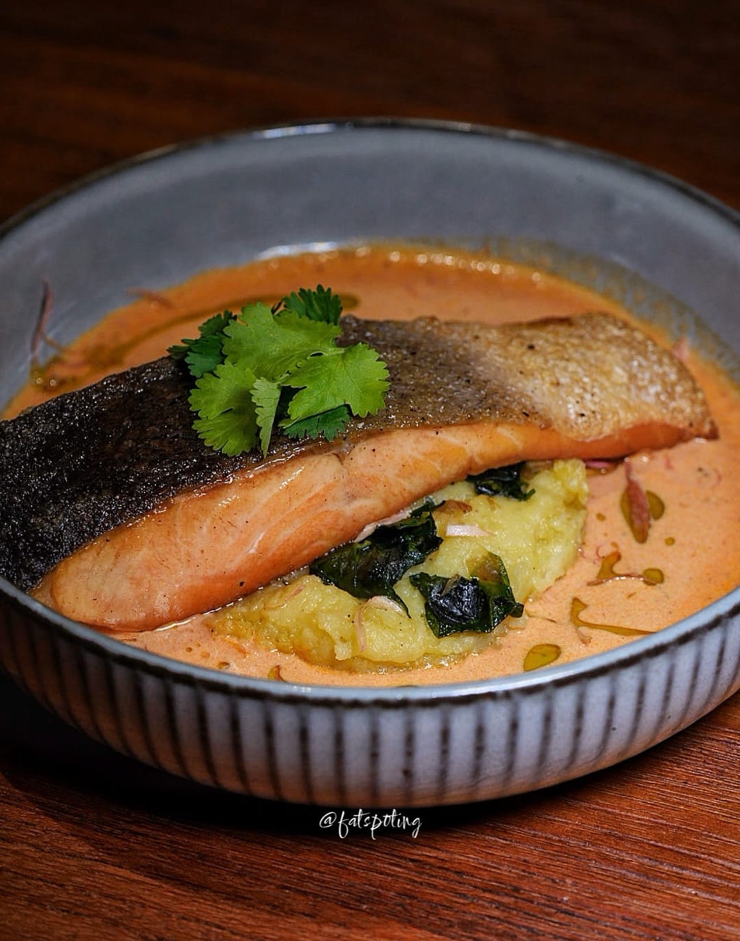 A wink to “Western but Borneo,” this crowd-pleaser lands a crisp-skinned fillet on a little “island” of mash and vegetables, ringed by a mellow tomato-cream. Comforting and familiar, but less adventurous compared to the rest of the menu.