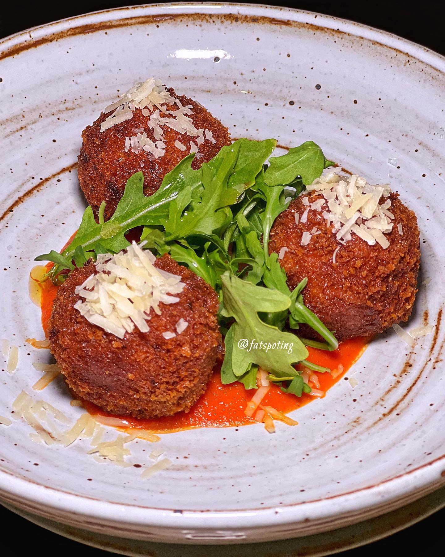 Sobrasada croquettes - Risotto croquettes cooked with cured ground pork sausage & spices, tomato-based sauce, topped with fresh parmesan