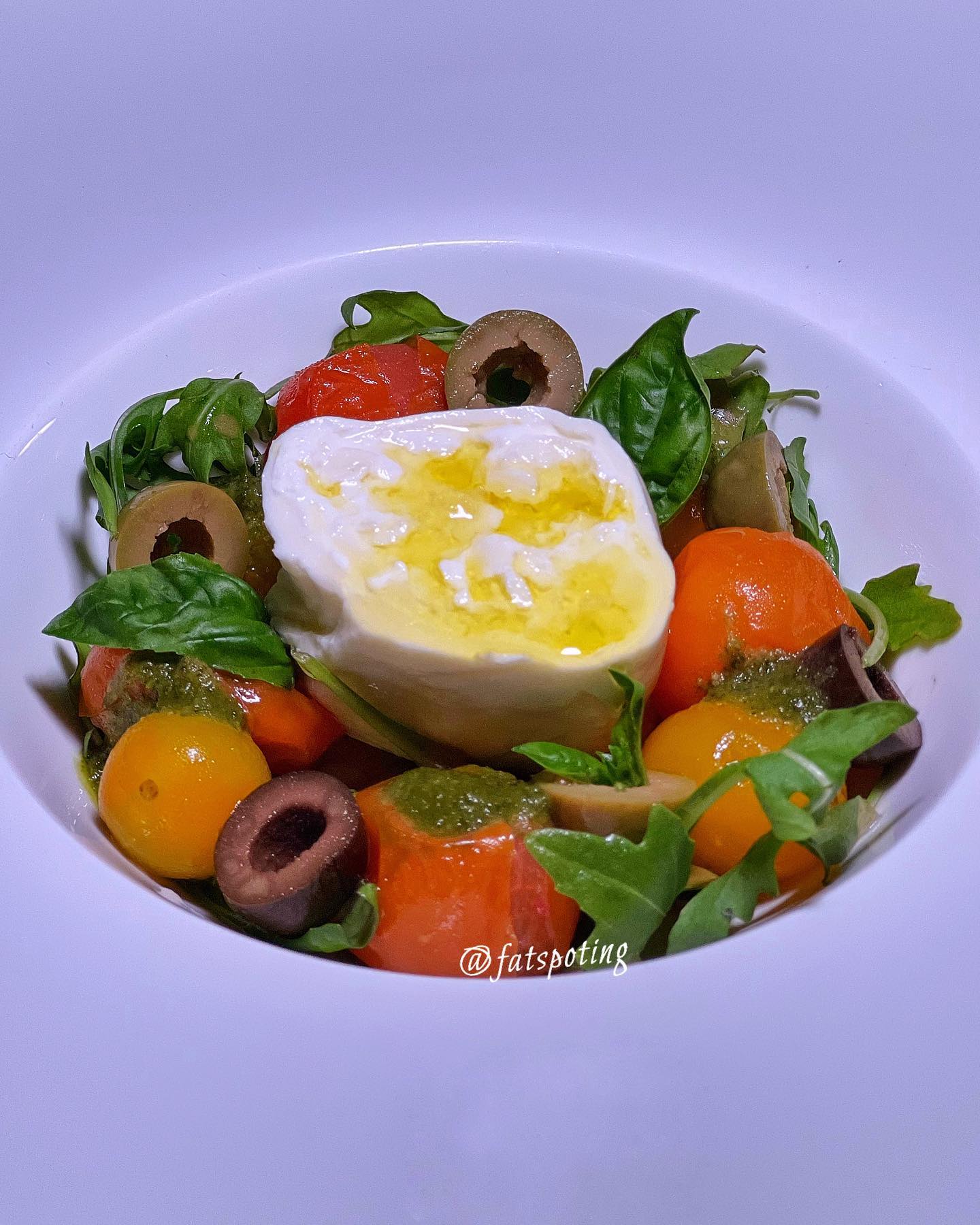 Burrata & Kalamata - Burrata cheese, candy tomatoes, Kalamata olives, basil, pesto dressing