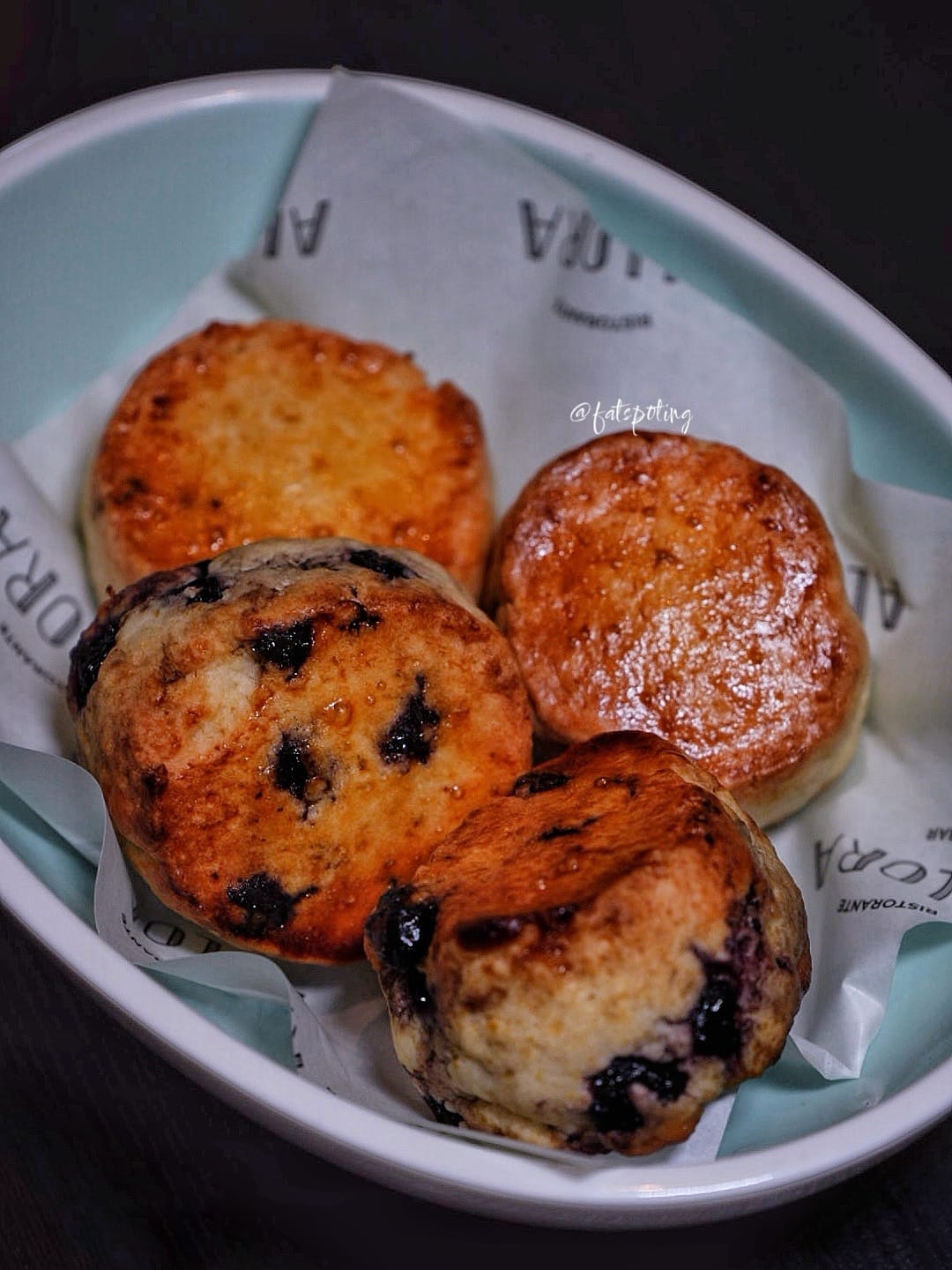 Classic and Blueberry Scones are served with Clotted Cream and Raspberry Jam, accompanied by a choice of coffee or tea per person.