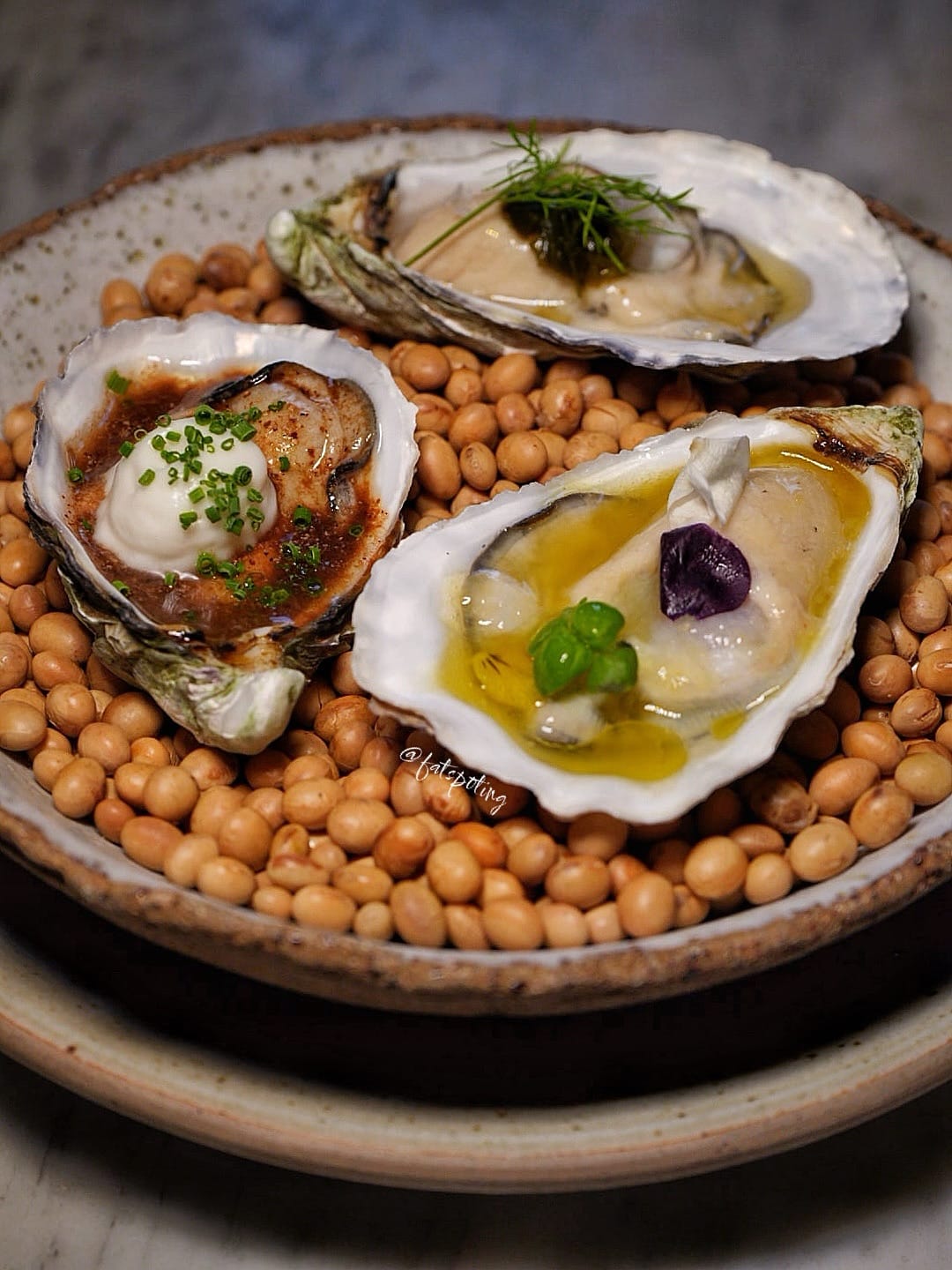 The tasting menu opens with a bright Busker Light whisky highball before moving into an expressive trio of Ostra Regal Amulette oysters, each layered with kombu, Guinness, sake kasu or preserved lemon to highlight brine, smoke and umami in different shades.