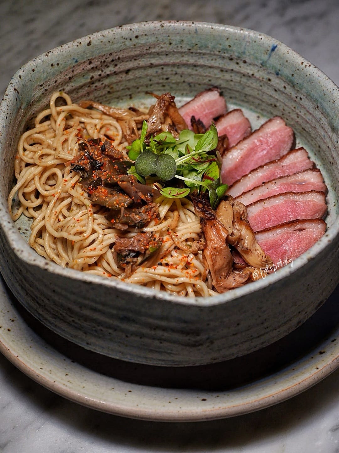 The smoked Silverhill duck, glazed with Fercullen whisky and set over Upgrain mazemen with Guinness dashi and local Fogo Fungi, captures the spirit of the collaboration: rich yet lifted, familiar yet reimagined. The John Stone beef hammer shin follows with a sake-kasu stroganoff and malfadine, its depth balanced by pickled kale and Chinese celery oil.