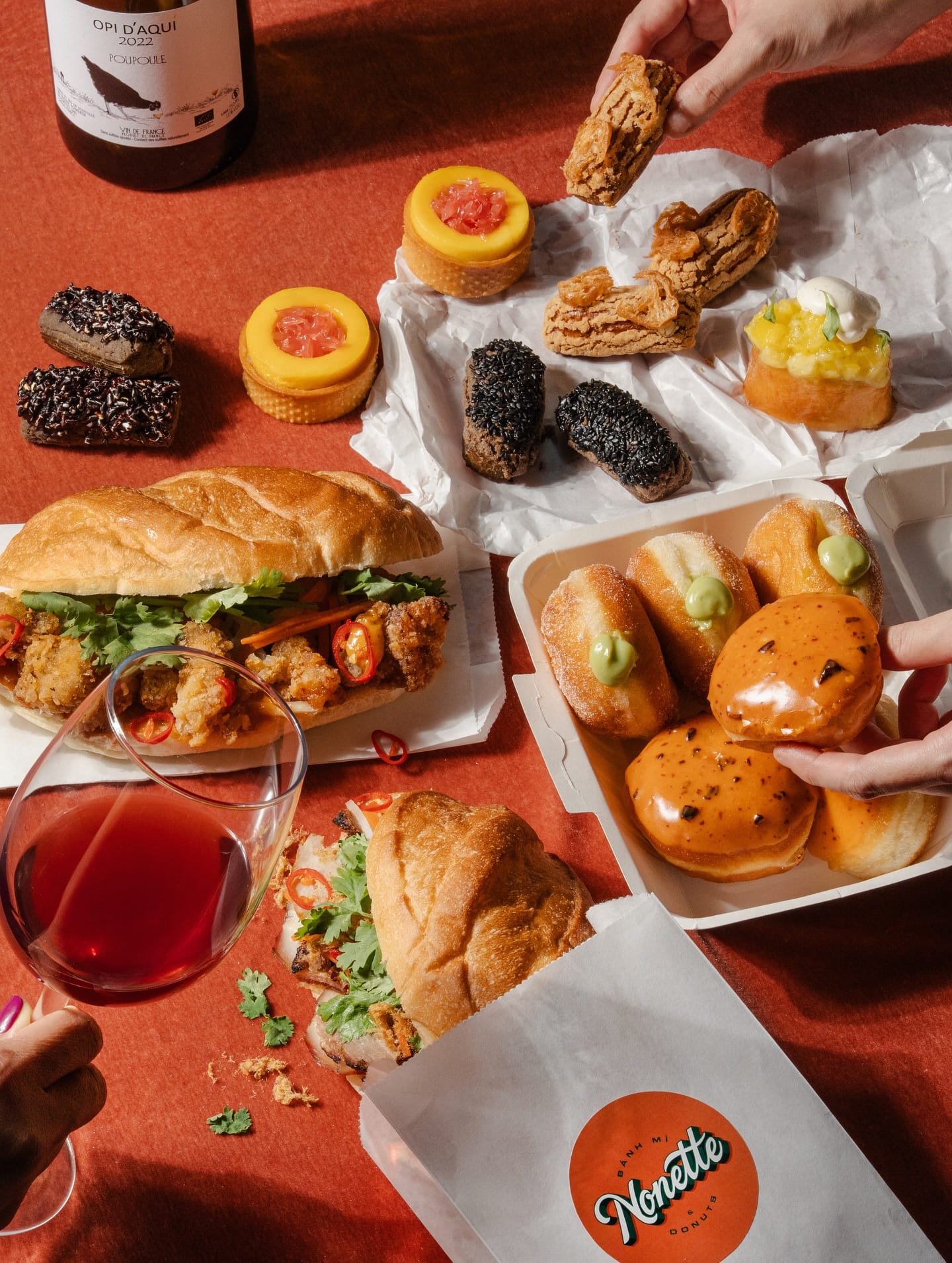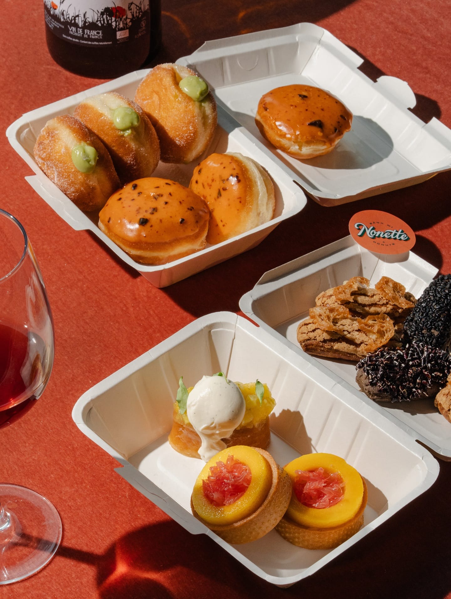 The Apéro Box which comes with one bánh mì, one donut and two éclairs for $19. It’s a great way to sample the Nonette experience. Pair it with a glass of natural wine — selections include easy-drinking picks from France and Slovenia — and you’re set for a great evening.