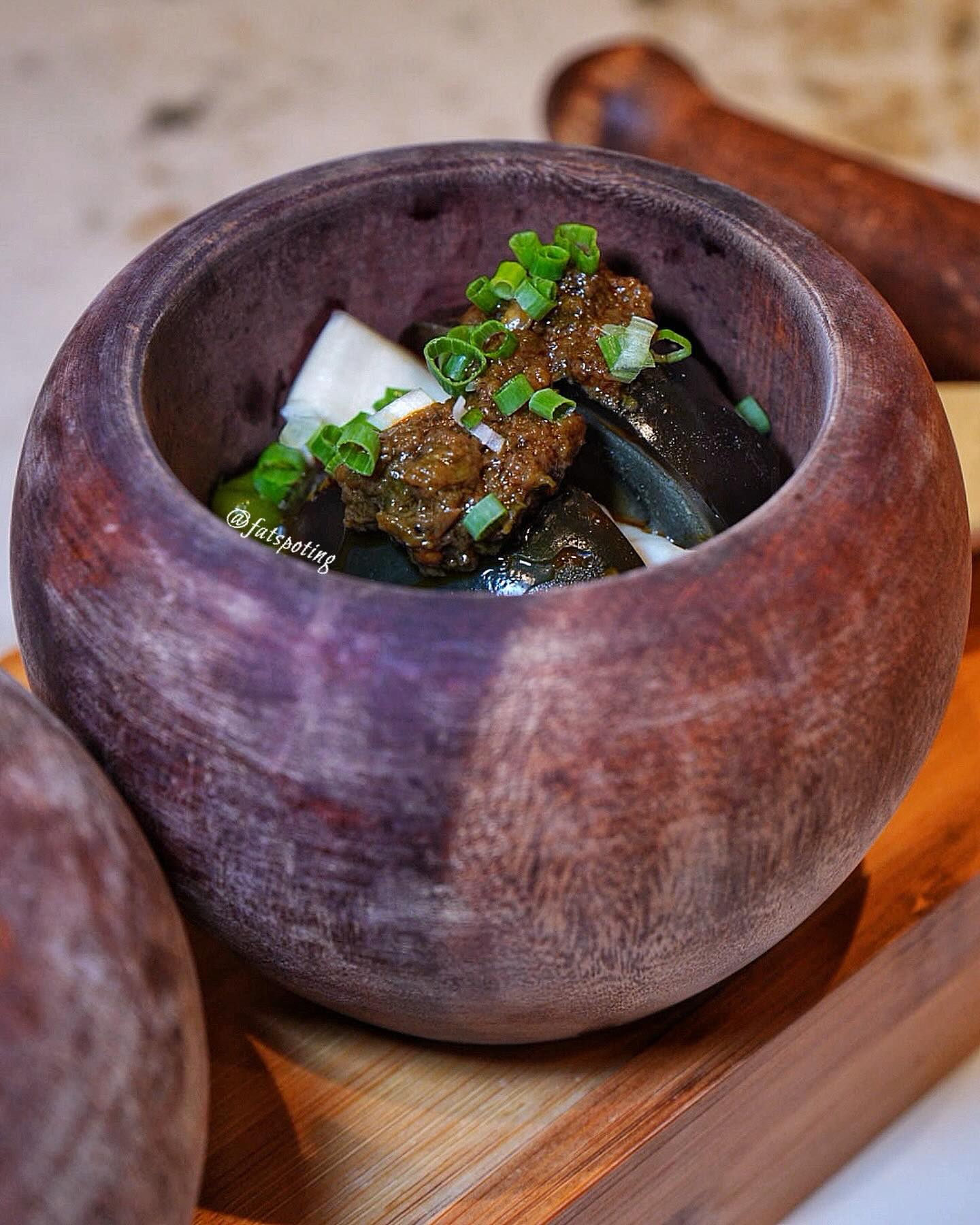 A unique appetizer where you gotta mash the ingredients in a mortar and pestle to blend everything together.