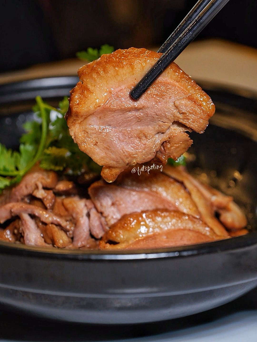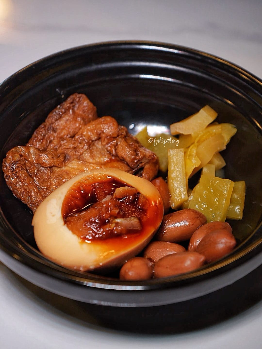 Half or whole duck slow-braised with Rishiri konbu, aged tangerine peel, and premium soy sauce, using richer London Fat Duck. Texture is luxuriously tender. Paired with taupok, egg, peanuts, and dips of green chilli–coriander and fermented soybean vinegar.