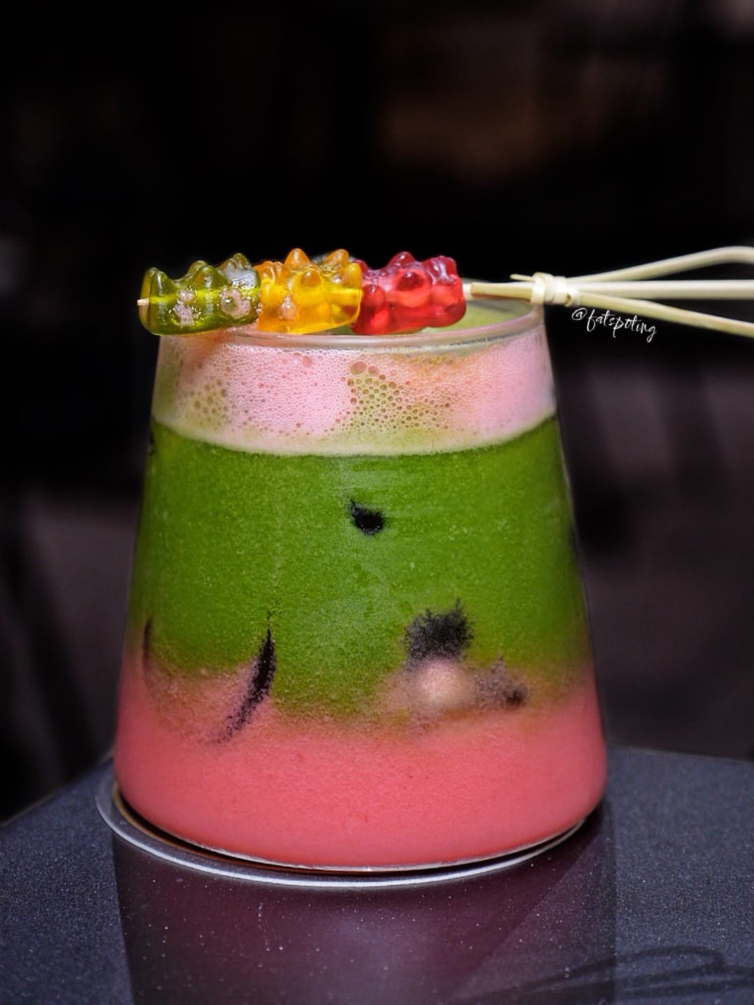 Visually striking and layered with intention, this two-tone creation blends strawberry and mango-bergamot tea with Yakult, lifted by a touch of lemon and rounded off with earthy matcha. The contrasting flavours come together harmoniously - bright, slightly tangy and beautifully balanced. The garnish of gummy bears adds a whimsical finish without compromising the drink's overall elegance.