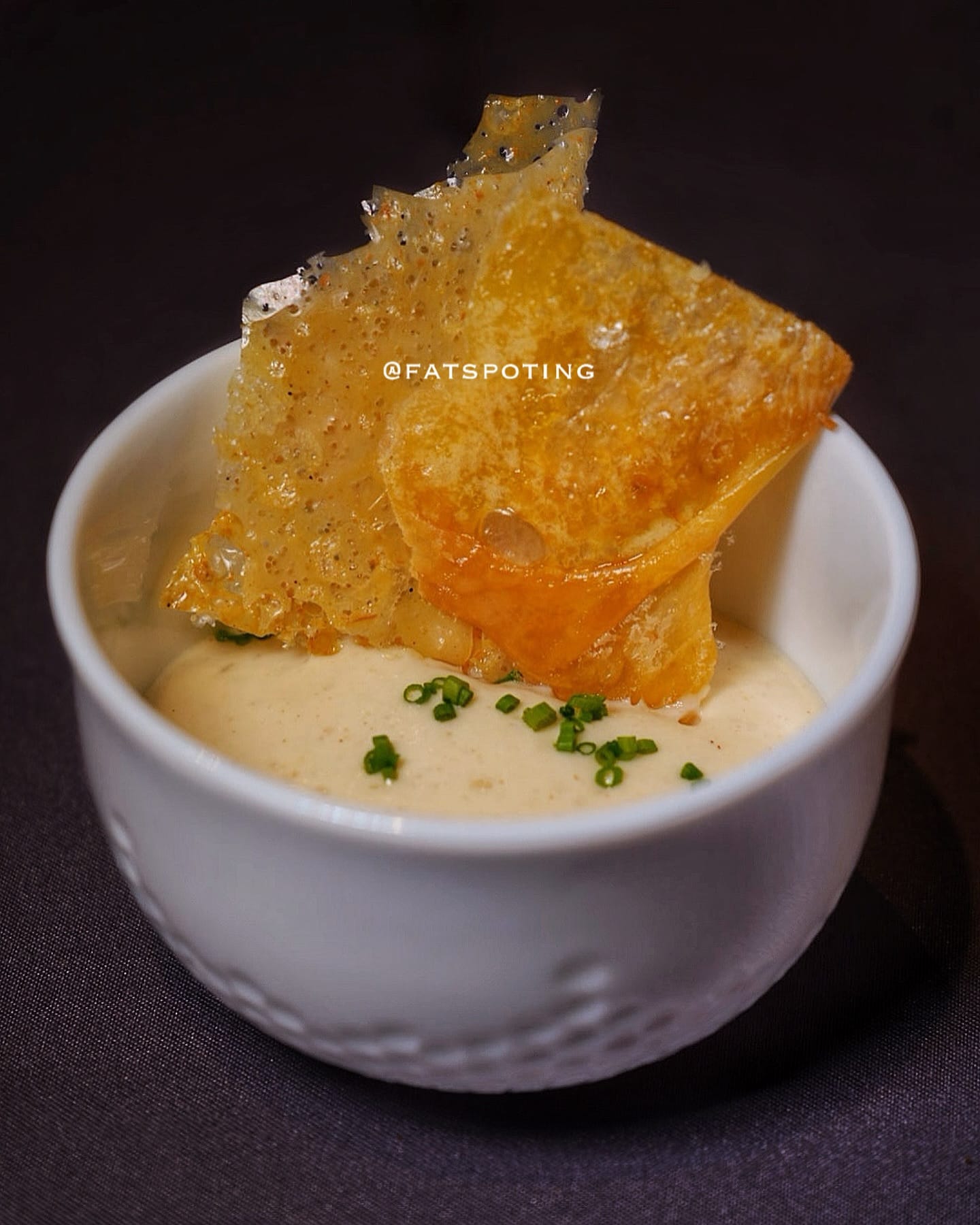This California Jack Cheese brings depth and subtle smokiness. Its creamy consistency melds seamlessly with the delicate sous vide egg and the light, airy espuma. The crisp chicken skin provides a contrasting texture, making each bite a harmonious blend of creamy, smokey and crunchy elements.