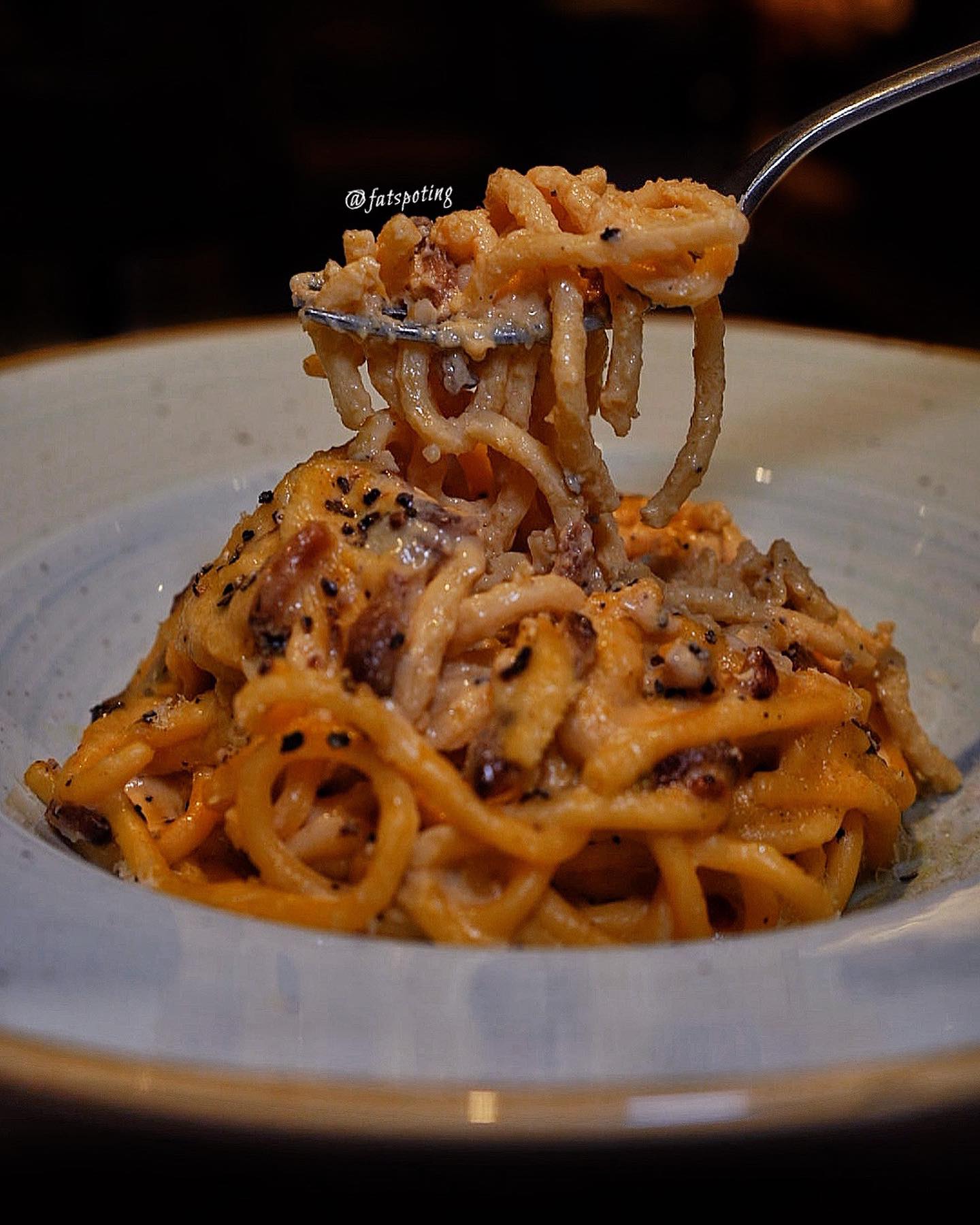 Takes you on a journey to Rome with its traditional preparation using Guanciale, Pecorino, Egg Yolk, and Black Pepper, creating a rich, creamy sauce that clings perfectly to the Chitarra's unique texture.