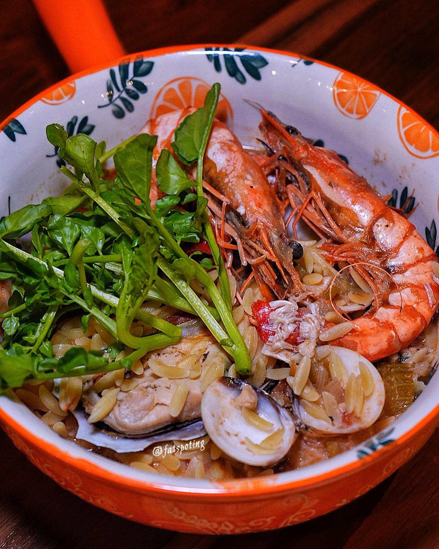 A treasure trove of prawns, scallops, mussels and clams, with Orzo pasta to soak up the stew's delectable goodness.