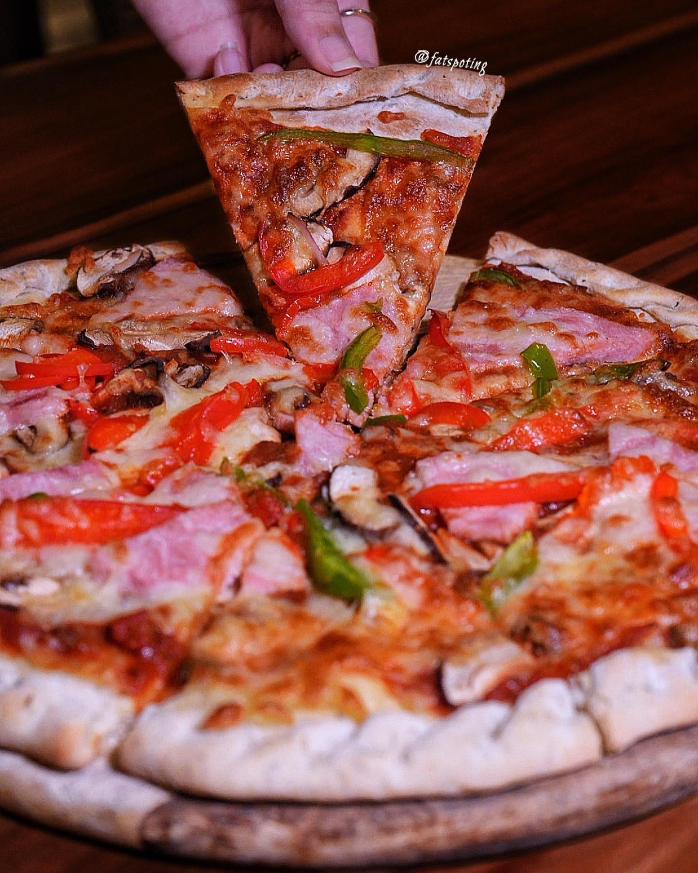 Gammon ham, capsicum, mushroom and tangy salsa, baked with Mozarella till gooey and golden brown.