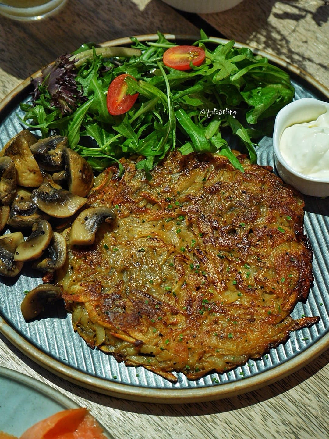 Crisp-edged russet hash topped with mesclun salad, cherry tomatoes and chives, served with sour cream. Add on sautéed mushrooms, bacon or smoked salmon for a savory touch.