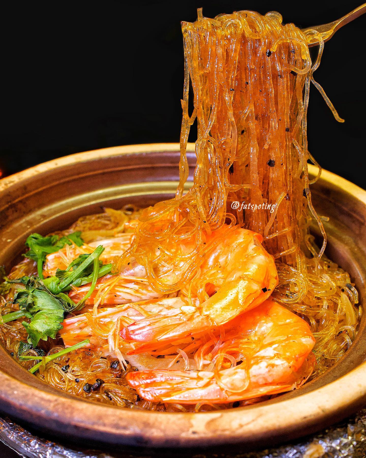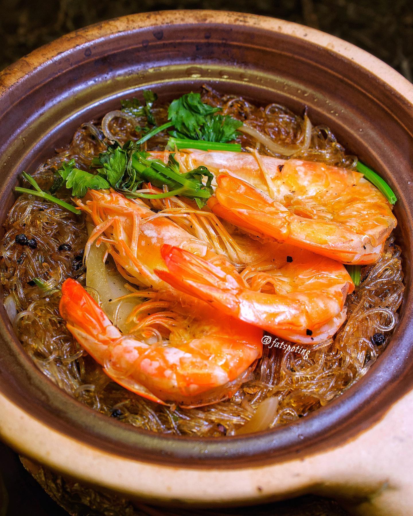 Succulent king prawns atop a bed of springy, rich and flavorful glass noodles.